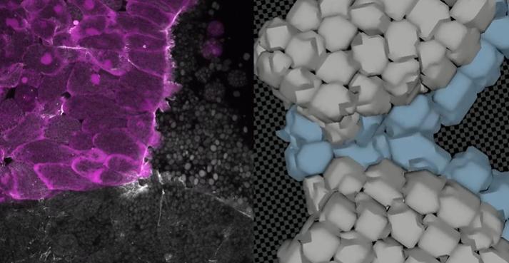 Movie 5.Interface between two DMZs in vitro (left) and in silico (right) migrating from 4 DMZs placed ITR. Left: Actin (greyscale) was labeled by injection of mRNA encoding LifeAct-RFP. Two of the four DMZs were labeled with Alexa 488 dextran (magenta-left panel) to identify individual DMZs. Confocal Z-stacks were collected at 3 min intervals (11 frames). Representative frames from a ITR simulation are shown on the right. |