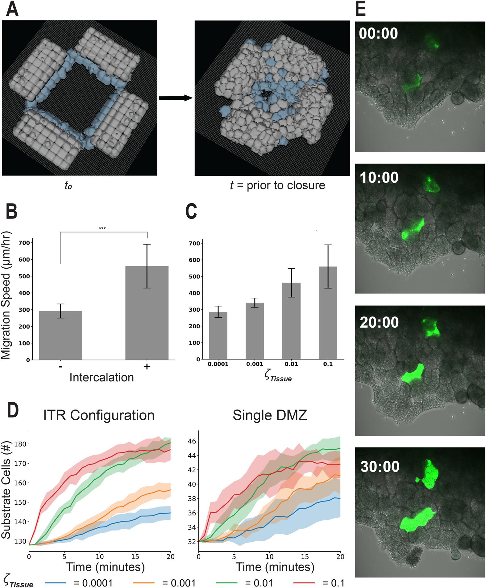 Fig. 5.Top-down intercalation increases migration speed in the DMZ explant. (A) Representative image of the ITR experiment after addition of rules to allow for passive intercalation. (B) Comparison of migration speed of closure with and without the addition of passive intercalation (n=10, mean±s.d., *** denotes significance at P<0.001 by independent samples t-test), and (C) migration speed measurements with different probabilities of cell–cell rearrangement per timestep, which correspond with likelihood of observed cell intercalation n=10, mean±s.d., for all parameterizations. Quantified number of cells (mean±s.d.) on the substrate throughout a 20 min simulated time course for all values of ζTissue for both the single DMZ and ITR in-silico configurations in (D), n=10 for all parameterizations. (E) Fluorescent dextran labeled mesendoderm cells sprinkled on top of an unlabeled DMZ explant reveal cell intercalation toward the substrate level over a 30 min time course confirming model intercalation behavior.