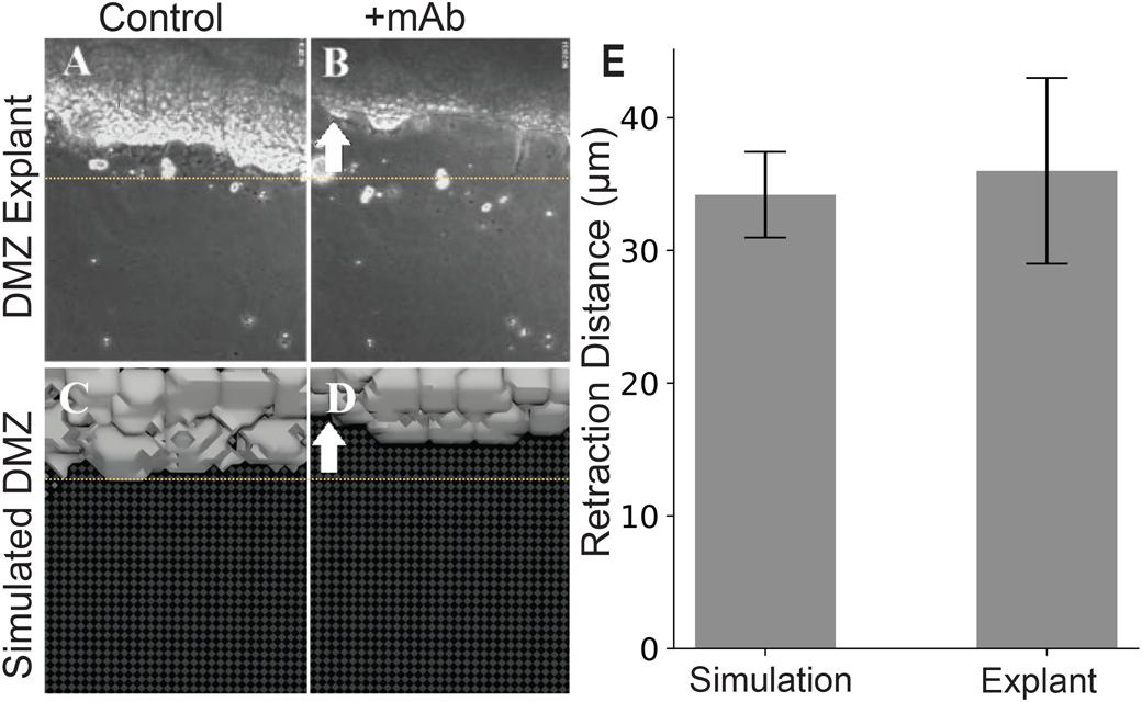 Fig. 6.In-silico disruption of cell–substrate binding results in comparable behavior to biological experiments. (A,B) Top-down (en face) images from the experiment in Davidson et al., 2002 (A) before and (B) after disruption of cell-substrate binding following addition of integrin a5b1 function-blocking mAB P8D4. Similar top-down images from a representative simulation (C) before and (D) after disruption of leader cell–substrate binding. White arrows represent the (B) experimentally observed and (D) simulated retraction direction. Yellow dashed lines in panels A–D are included as a visual guide to DMZ retraction limit. (E) Quantitative comparison of measured retraction distances (mean±s.e.m) from 10 experiments each are shown. Panels A and B are reproduced from Davidson et al. (2002) with permission from the publisher, Elsevier. |