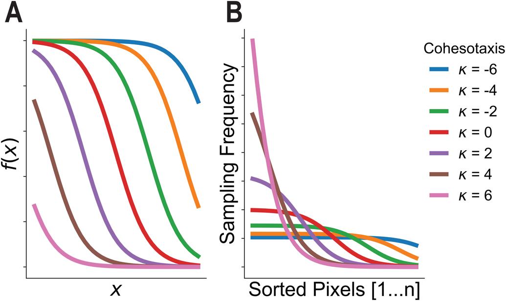 Fig. 7.Development of the cohesotaxis voxel selection probability function. (A) Plotted Sigmoid functions from equation 5. (B) Sorted voxels are selected to establish migratory bias by sampling with frequency defined by normalized sigmoid functions in B. |