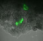 Movie 7.Timelapse movie showing integration of single dextran Alexa488-labeled cells applied onto an unlabeled DMZ explant migrating on fibronectin substrate. Mesendoderm cells, labeled by injection of Alexa488 dextran (green), were dissociated from sibling embryos and placed on top of an unlabeled DMZ migrating on a fibronectin substrate. Confocal Z-stacks were collected at 1 min intervals (32 frames). |