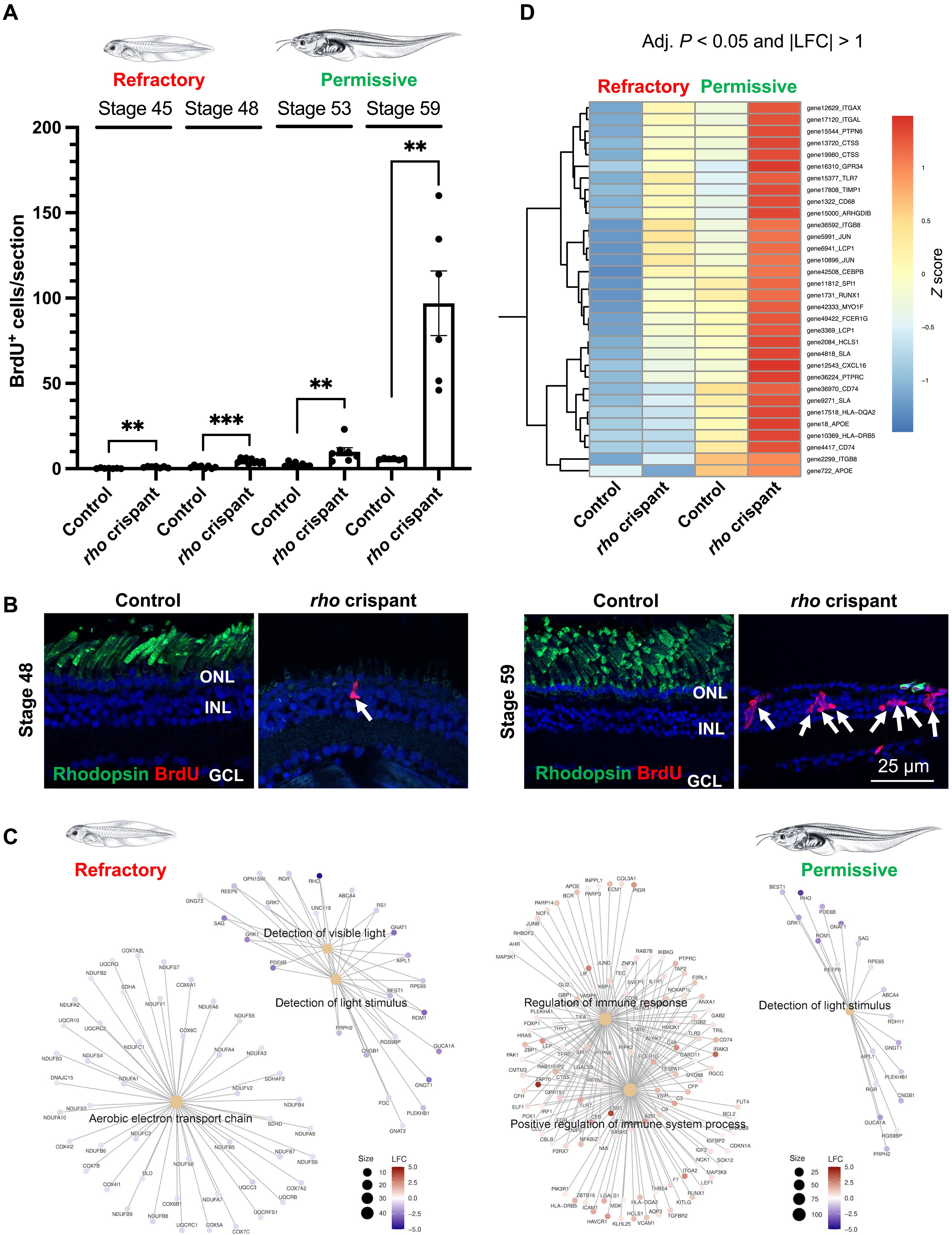 Fig. 1. The response of Müller cells to injury varies along with aging in Xenopus tadpoles. (A and B) Quantification of BrdU-positive cells in control and rho crispant tadpole retinal sections at different stages, following exposure to BrdU solution for 3 days. Data are represented as means ± SEM, and each point represents one retina. **P < 0.01; ***P < 0.001 (Mann-Whitney test). Shown in (B) are representative images of retinal sections colabeled for BrdU and rhodopsin at a young (refractory) and old (permissive) tadpole stage. Rhodopsin labeling shows the efficacy of rho knockout, and the absence of outer segments indicates degeneration of rods in rho crispants at both stages. Nuclei are counterstained with Hoechst. Arrows point to BrdU-positive cells. GCL, ganglion cell layer; INL, inner nuclear layer; ONL, outer nuclear layer. (C) Gene-Concept network (cnetplot) based on the enriched biological processes at refractory and permissive stages (rho crispant tadpoles relative to controls), retrieved from GSEA results of LFC ranked gene list (see table S1). (D) Extract from the clustered heatmap of DEGs belonging to the microglial molecular signature. All genes regrouped here show a higher expression at the permissive stage in rho crispant tadpoles compared to all other conditions (refer to fig. S4 for the complete heatmap). |