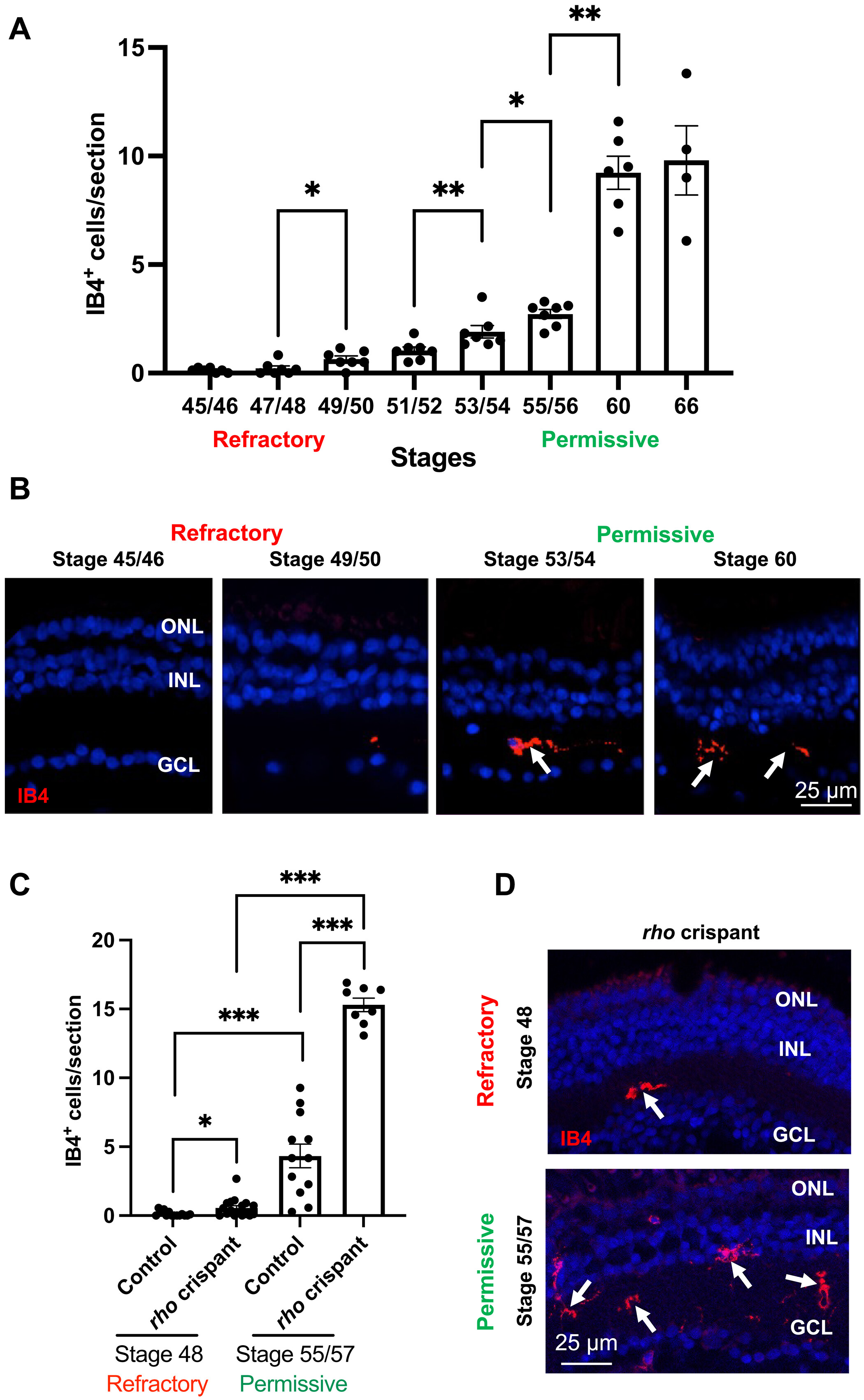 Fig. 2. The presence of microglia in the retina correlates with the extent of Xenopus Müller cell proliferation upon injury. (A and B) Quantification of IB4-positive cells (microglia) on retinal sections from wild-type tadpoles at different stages. Shown in (B) are representative images of retinal sections at two refractory and two permissive stages. (C and D) Quantification of IB4-positive cells on retinal sections from control and rho crispant tadpoles at a refractory and a permissive stage. Shown in (D) are representative images of retinal sections. Nuclei are counterstained with Hoechst. Arrows point to IB4-positive cells. Data are represented as means ± SEM, and each point represents one retina. *P < 0.05; **P < 0.01; ***P < 0.001 (Mann-Whitney test). GCL, ganglion cell layer; INL, inner nuclear layer; ONL, outer nuclear layer. |