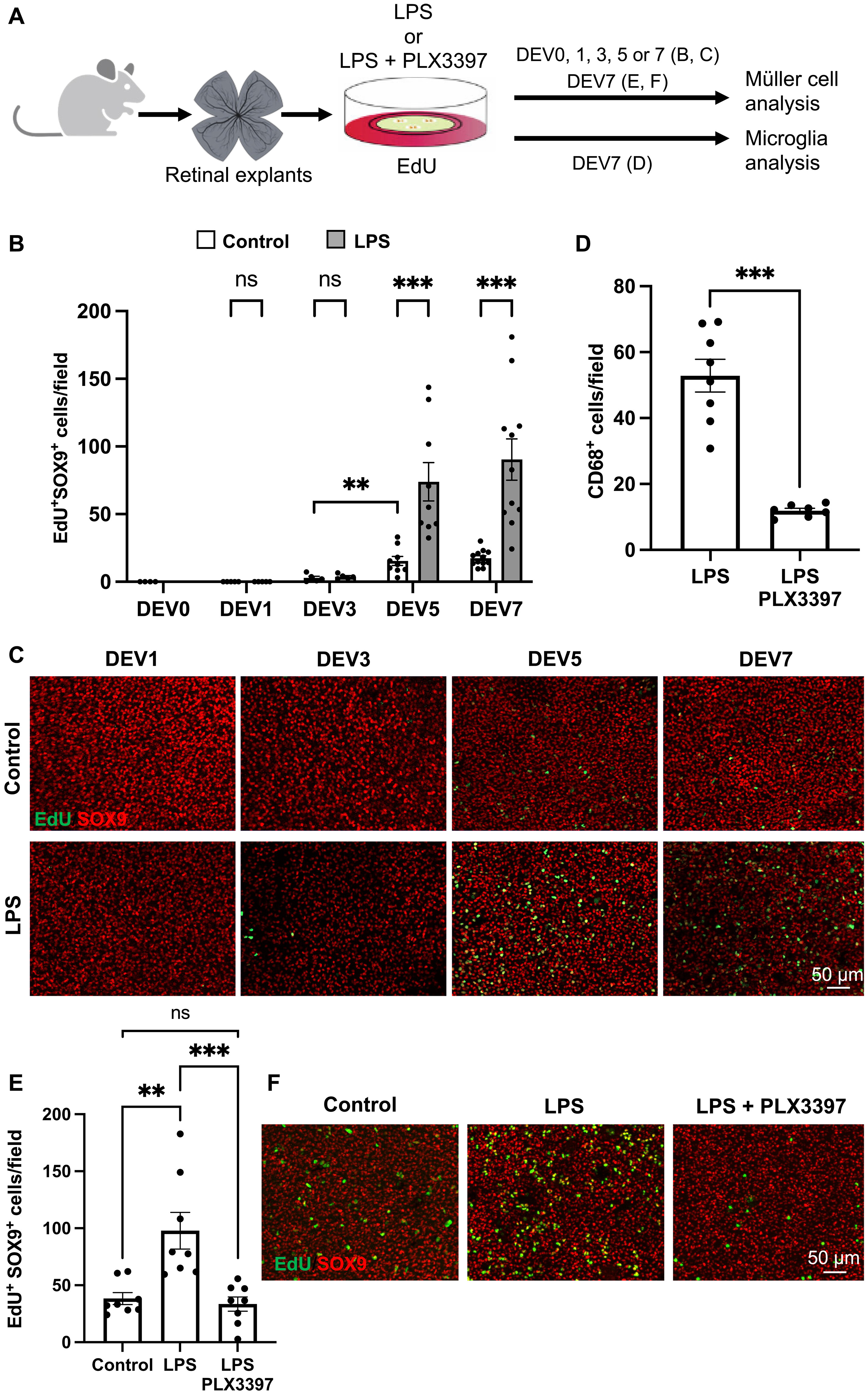 Fig. 5. An inflammatory challenge is sufficient to enhance the proliferation of Müller glial cells in mouse retinal explants. (A) Procedure used in (B) to (F). Retinas from wild-type mice were flattened and cultured for 1 to 7 days (DEV1 to DEV7) in the presence of EdU alone (control) or together with either LPS alone [(B) and (C)] or LPS plus PLX3397 [(D) to (F)]. Retinal explants were then processed for immunostaining analysis. DEV0 corresponds to an uncultured retina. Created using BioRender.com. (B and C) Quantification of double EdU-positive and SOX9-positive cells (proliferative Müller cells) at different time points in control and LPS-treated retinal explants. Shown in (B) are representative images of flat-mounted retinas. (D) Quantification of CD68-positive cells (activated microglia) in retinal explants treated with LPS or with LPS plus PLX3397. (E and F) Quantification of double EdU-positive and SOX9-positive cells in control, LPS-treated, and LPS plus PLX3397-treated retinal explants. Shown in (F) are representative images of flat-mounted retinas. Data are represented as means ± SEM, and each point represents one retinal explant. ns, not significant; **P < 0.01; ***P < 0.001 (Mann-Whitney test). |