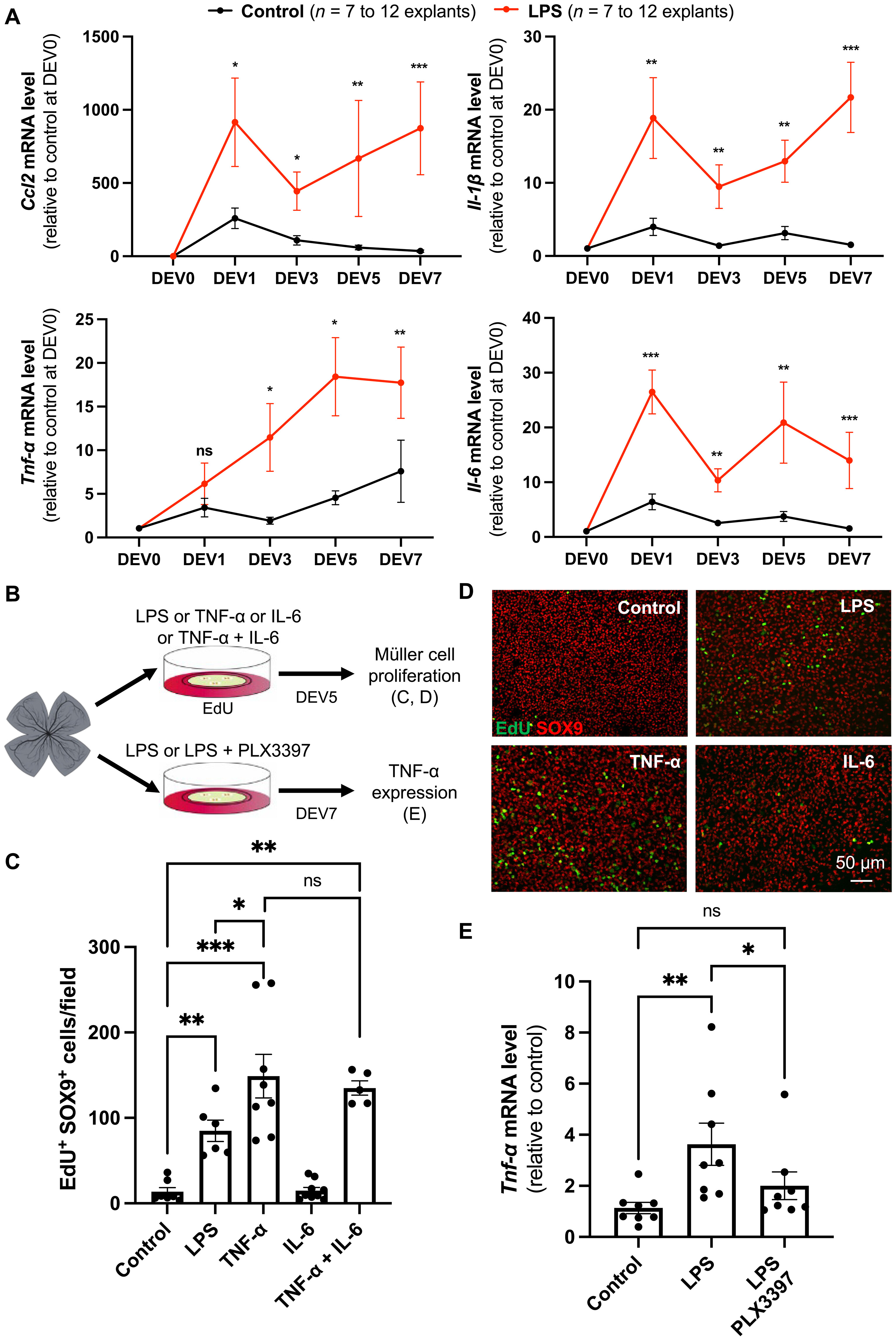 Fig. 6. TNF-α is a mediator of microglia-dependent Müller cell proliferation. (A) qPCR analysis of Ccl2, Il-1β, Tnf-α, and Il-6 expression in control and LPS-treated retinal explants at different culture time points, relative to uncultured control condition (DEV0). (B) Procedure used in (C) to (E). Retinas from wild-type mice were flattened and cultured for 5 days in the presence of EdU alone (control) or in combination with LPS, TNF-α, IL-6, or TNF-α plus IL-6. Retinal explants were then processed for immunostaining analysis [(C) and (D)]. Other retinal explants were cultured for 7 days in the presence of LPS or LPS plus PLX3397 and subjected to qPCR analysis (E). Created using BioRender.com. (C and D) Quantification of double EdU-positive and SOX9-positive cells (proliferative Müller cells). Shown in (D) are representative images of flat-mounted retinas. (E) qPCR analysis of Tnf-α gene expression. Data are represented as means ± SEM, and each point represents one retinal explant. ns, not significant; *P < 0.05; **P < 0.01; ***P < 0.001 (Mann-Whitney test). |