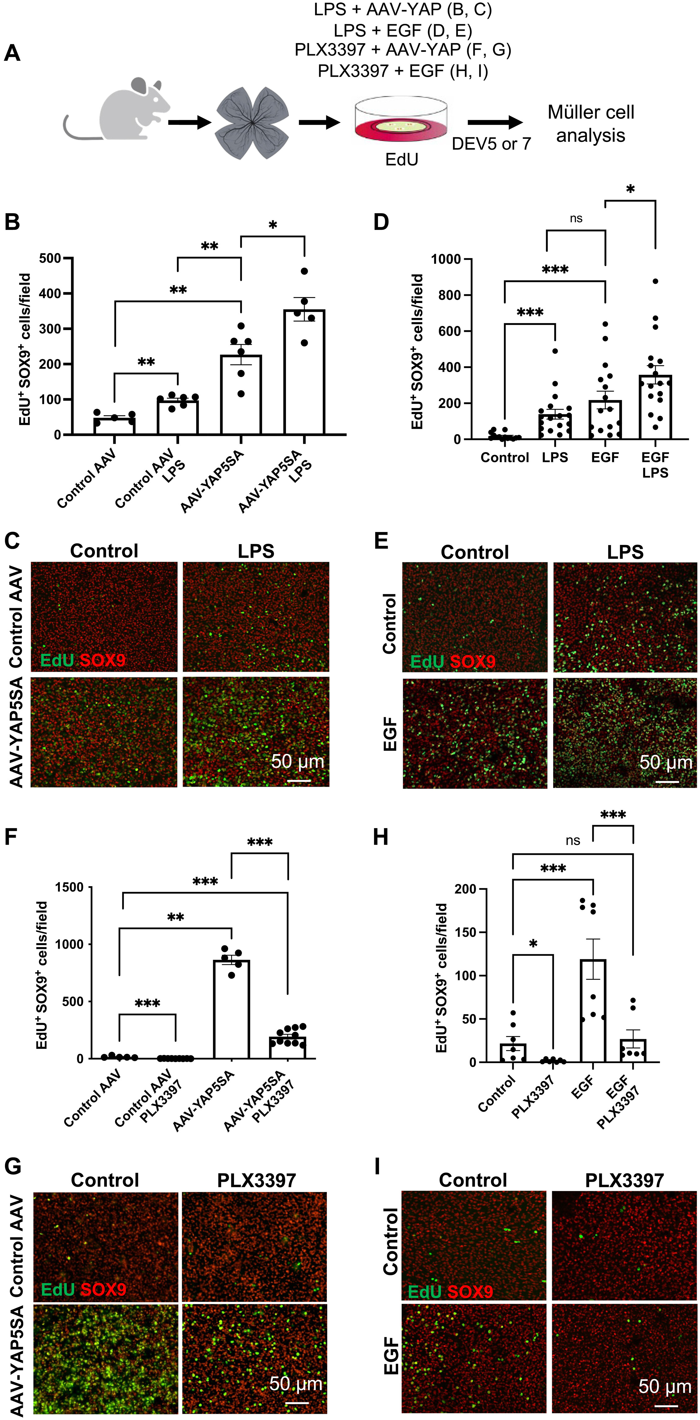 Fig. 7. Inflammatory signaling is required for EGF and YAP to trigger the proliferation of murine Müller cells. (A) Procedure used in (B) to (I). Retinas from wild-type mice were flattened and cultured for 5 days in the presence of EdU and LPS or PLX3397, together with EGF, or for 7 days if together with AAV-GFP (control AAV) or AAV-YAP5SA. Retinal explants were then processed for immunostaining analysis. Created using BioRender.com. (B to E) Quantification of double EdU-positive and SOX9-positive cells (proliferative Müller cells) in retinal explants exposed to LPS and transduced with either control AAV or AAV-YAP5SA [(B) and (C)] or treated with EGF [(D) and (E)]. Shown in (C) and (E) are representative images of flat-mounted retinas. (F to I) Quantification of double EdU-positive and SOX9-positive cells in retinal explants exposed to PLX3397 and transduced with either control AAV or AAV-YAP5SA (F) or treated with EGF (H). Shown in (G) and (I) are representative images of flat-mounted retinas. Data are represented as means ± SEM, and each point represents one retinal explant. ns, not significant; *P < 0.05; **P < 0.01; ***P < 0.001 (Mann-Whitney test). |