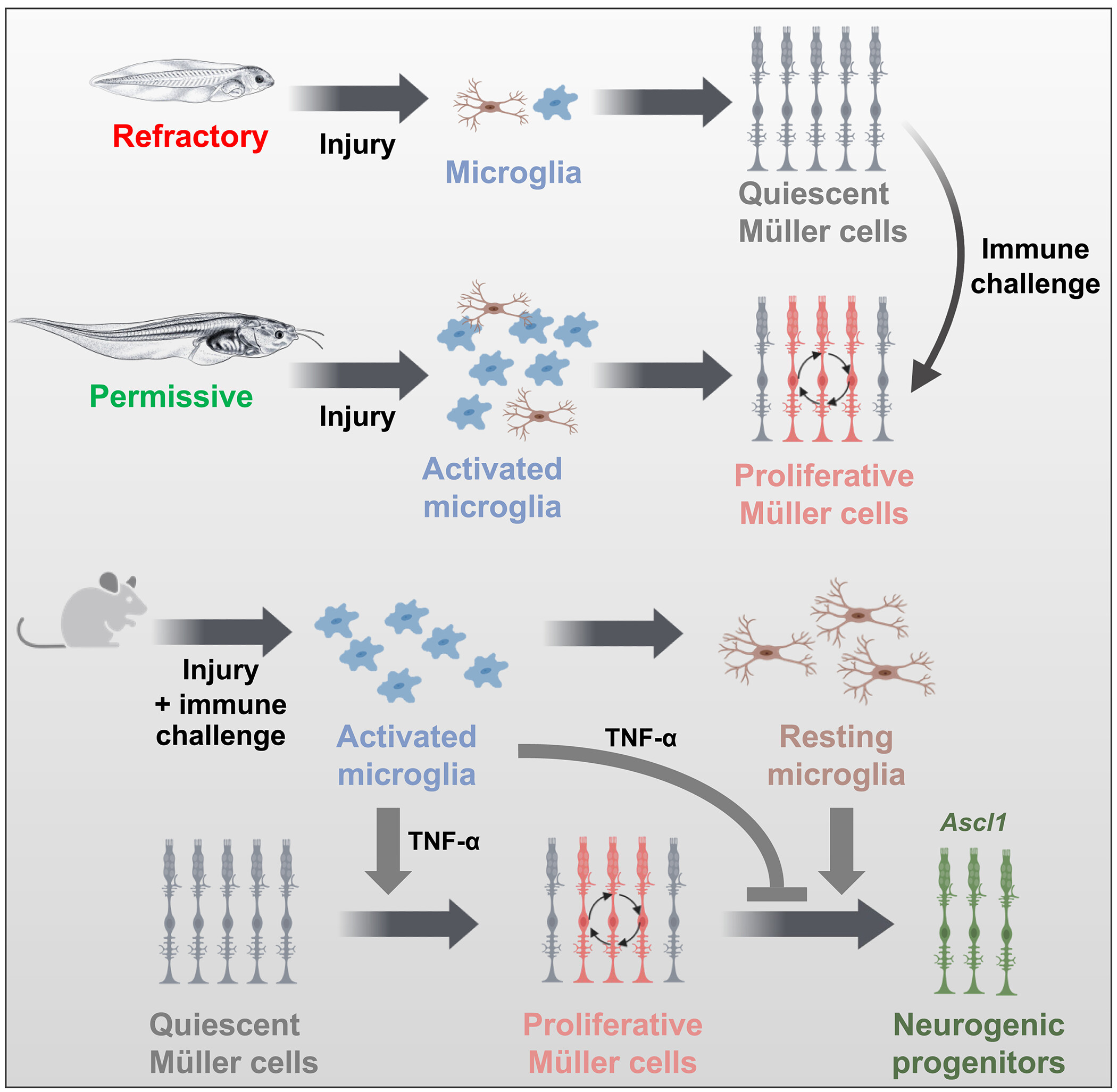 Fig. 10. Model illustrating the influence of inflammatory signaling on the response of Müller cells to injury. In young Xenopus tadpoles (refractory stages), there are very few microglia in the retina, which could account for the very limited proliferative response of Müller cells in a variety of retinal injury models. In contrast, microglia are more abundant in old tadpoles (permissive stages) and are required for Müller glia to reenter into the cell cycle upon injury. At refractory stages, Müller cells can become proliferative following retinal damage if an immune challenge is provided. In mice, an immune challenge also promotes the proliferation of Müller cells but inhibits their neurogenic potential. An inflammatory state must be sequentially activated and attenuated to achieve both proliferation and neurogenic gene expression. Last, we identified TNF-α as at least one of the cytokines that mediates both proliferative and antineurogenic effects of microglia on Müller cells. Created using BioRender.com. |