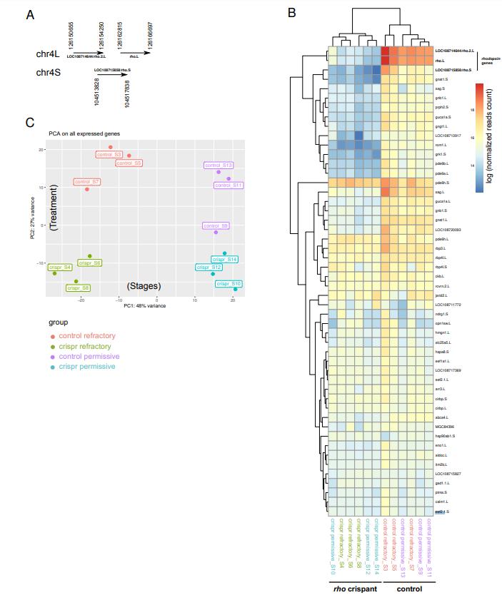 Figure S2. Mapping data. Following adapter trimming, the RNAseq data were mapped to Xenopus laevis genome 9.2 and uniquely mapped reads were assigned to genes using the annotation available on Xenbase. (A) Chromosomal locations of the three rho loci targeted by CRISPR/Cas9. (B) Clustered heatmap of the 50 most expressed genes of the RNAseq dataset. It highlights the clear separation between rho-crispant and control tadpoles. (C) Principal component analysis (PCA) on expressed genes of the RNAseq dataset. PC1 (48%) is most likely associated with the developmental stage of the tadpoles, while PC2 (27%) is most likely associated with the treatment condition. Components 1 and 2 explain together 75 % of the variance. |