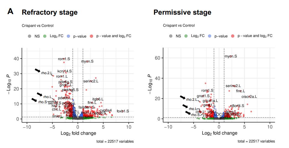 Figure S3. Differential gene expression at refractory and permissive stages. (A) Volcano plot representing differentially expressed genes at refractory and permissive stages. 456 and 272 genes are statistically differentially expressed (|LFC| >1, padj <0.05) at refractory and permissive stages, respectively. Arrows point to rho genes targeted by CRISPR/Cas9. (B) Enriched cell-type molecular signature identified based on the differentially expressed genes (|LFC| >1 and padj <0.05). Numbers in bars represent observed/expected genes. |