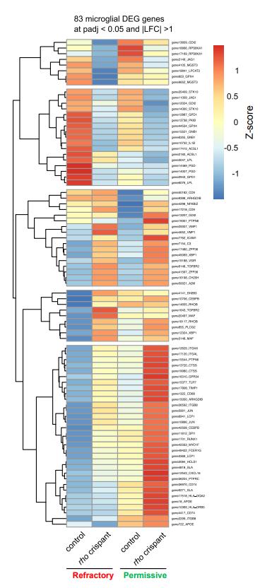 Figure S4. Heatmap of differentially expressed genes. Clustered heatmap of differentially expressed genes belonging to the microglia molecular signature. Enlargement of the cluster of interest is shown in Fig. 1D. |