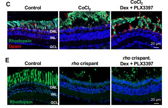 Figure S5. Dex plus PLX3397 treatment efficiently decreases the number of microglial cells in CoCl2- injected or rho crispant tadpoles, without impacting retinal degeneration. (A) Outline of the experimental procedure used in (B-E). Stage 56/62 (permissive stage) CoCl2-injected (B, C) or rho crispant (D, E) tadpoles were soaked in PLX3397 plus Dex solution for 5 days (5d) or 1 week (1w) as indicated, starting one day before CoCl2 injection. They were then processed for immunolabeling on retinal sections. (B, D) Quantification of IB4-positive cells (microglia). (C, E) Representative images of retinal sections labeled for Opsins (cones) and/or Rhodopsin (rods). Nuclei are counterstained with Hoechst. Data are represented as mean ± SEM, and each point represents one retina. ***P < 0.001 (Mann-Whitney test). GCL, ganglion cell layer; INL, inner nuclear layer; ONL, outer nuclear layer. |