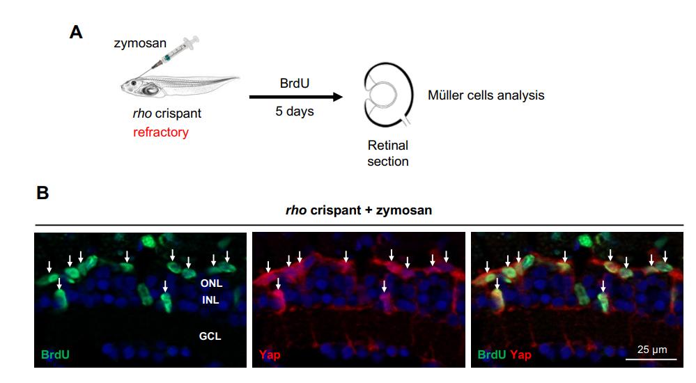 Figure S6. Proliferative cells upon zymosan injection at the refractory stage are Müller cells. (A) Outline of the experimental procedure used in (B). Stage 48/49 (refractory) rho crispant tadpoles were intraocularly injected with zymosan and then exposed to BrdU solution for 5 days before being processed for immunolabeling on retinal sections. (B) Representative images of retinal sections colabeled for BrdU and Yap. Arrows point to double-labeled cells. GCL, ganglion cell layer; INL, inner nuclear layer; ONL, outer nuclear layer. |