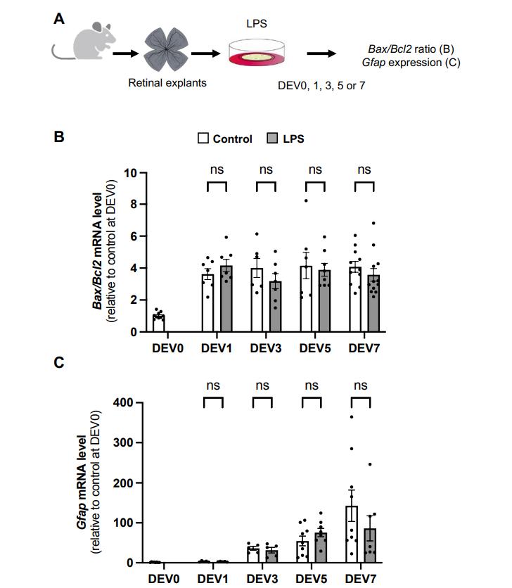 Figure S7. Absence of toxicity of LPS on retinal cells in mouse explants. (A) Outline of the experimental procedure used in (B, C). Retinas from wild-type mice were flattened and cultured for up to 7 days in the presence of LPS. They were then processed for qPCR analysis. (B, C) qPCR analysis of Bax/Bcl2 expression ratio (B) or Gfap expression (C) in control and LPS-treated retinal explants at different culture time points relative to uncultured control condition (DEV0). Data are represented as mean ± SEM, and each point represents one retinal explant. ns: non-significant (Mann-Whitney test). |