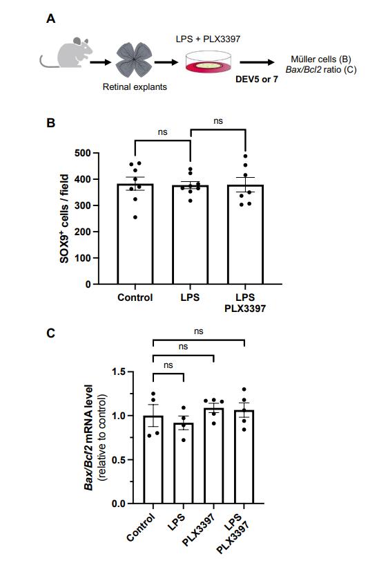 Figure S8. Impact of LPS plus PLX3397 treatment on the survival of mouse Müller glial cells. (A) Outline of the experimental procedure used in (B, C). Retinas from wild-type mice were flattened and cultured in the presence of LPS, PLX3397 or LPS plus PLX3397. Retinal explants were processed for immunostaining analysis at DEV7 (B) or processed for qPCR analysis at DEV5 (C). (B) Quantification of SOX9-positive cells (Müller cells). (C) Retinal qPCR analysis of Bax/Bcl2 expression ratio. Data are represented as mean ± SEM, and each point represents one retinal explant. ns: nonsignificant (Mann-Whitney test). |