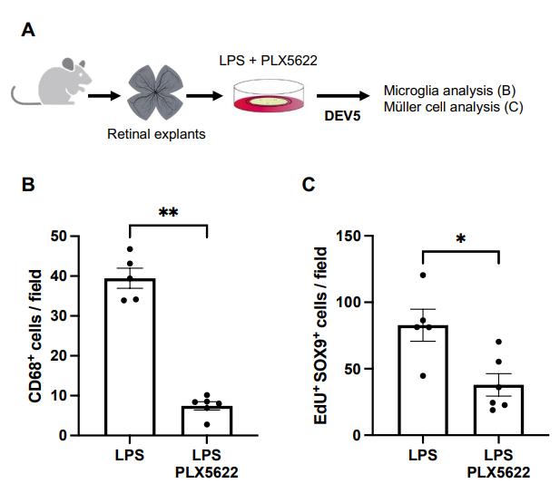 Figure S9. PLX5622 counteracts the LPS-driven proliferation of Müller glial cells in mouse retinal explants. (A) Outline of the experimental procedure used in (B, C). Retinas from wild-type mice were flattened and cultured for 5 days in the presence of EdU plus LPS, or plus LPS and PLX5622. Retinal explants were processed for immunostaining analysis at DEV5. (B, C) Quantification of CD68-positive cells (activated microglia, B) or double EdU- and SOX9-positive cells (proliferative Müller cells, C) in LPS or LPS plus PLX5622-treated retinal explants. Data are represented as mean ± SEM, and each point represents one retinal explant. *P < 0.05, **P < 0.01 (Mann-Whitney test). |
