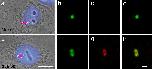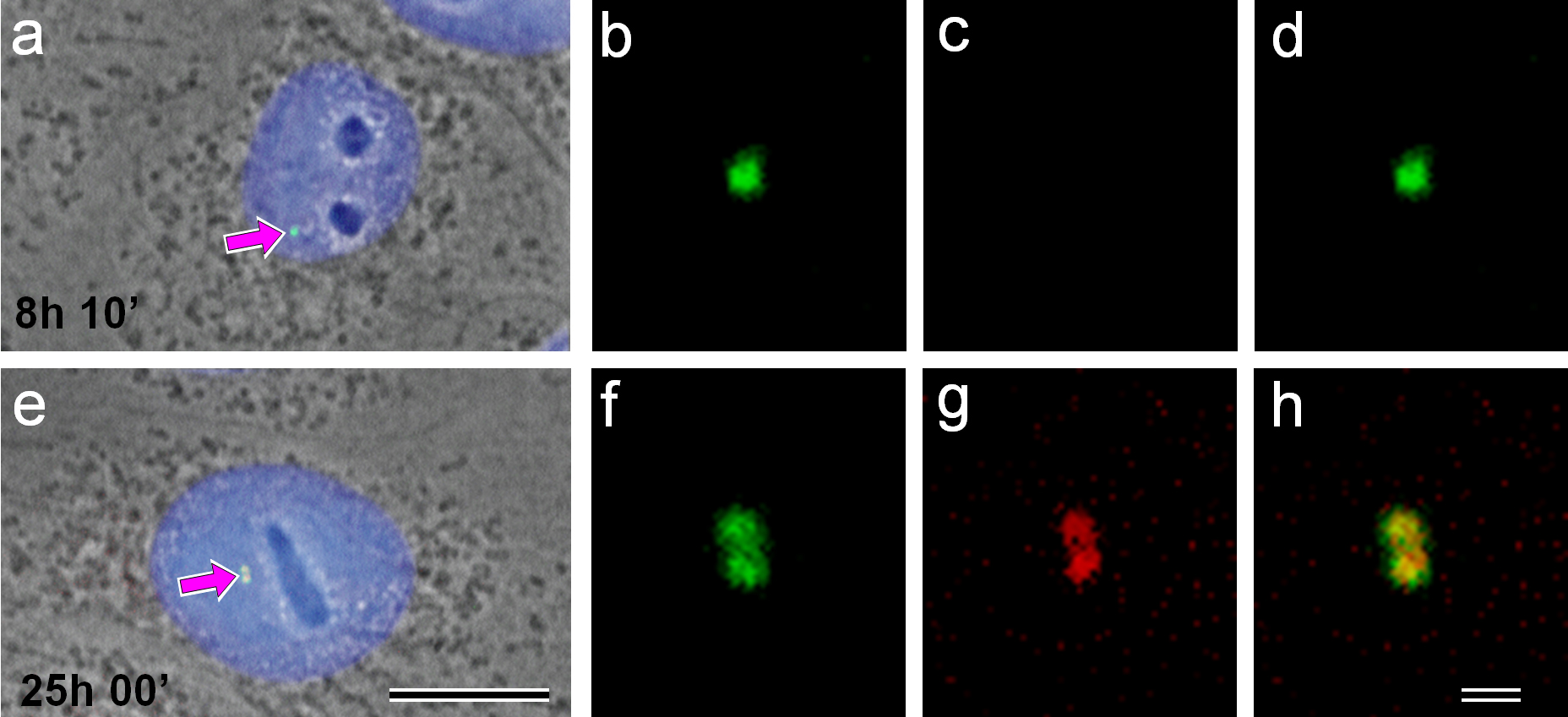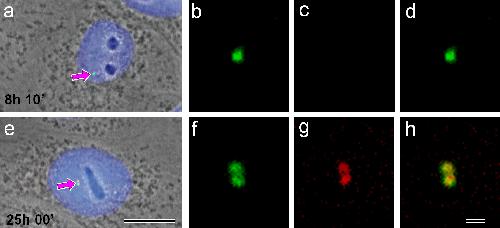 Cells were monitored after mitosis to define exact cell cycle timing. Cells in the middle of the G1-phase (8 h 10 min after mitosis—(a–d)) and G2-phase (25 h after mitosis—(e–h)) are presented. (a,e) combined phase-contrast images/4′,6-Diamidino-2-Phenylindole (DAPI) labeling of DNA for nuclear localization/double immunofluorescent labeling using polyclonal antibodies against gamma-tubulin and monoclonal antibodies against Aurora A are presented; (b,f) enlarged centrosome regions of these two cells after anti-gamma-tubulin labeling; (c,g) after anti-Aurora A labeling and (d,h) overlapping gamma-tubulin and Aurora A are shown. Centrosome position in whole-cell images marked by arrows (a,e). Bar 10 µm (a,e) and 1 µm (b–d, f–h).