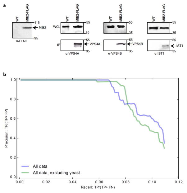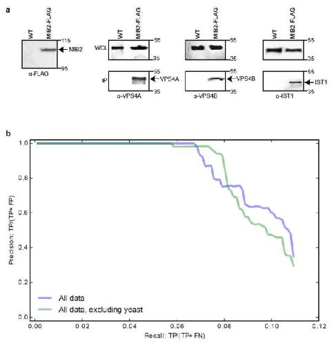 Extended Data Figure 6. Additional validation dataa, Confirmation of MIB2 interactions by co-immunoprecipitation. Extract (~10 mg protein) from cultured human HCT116 cells expressing FLAG-tagged MIB2 or control (WT) cells was incubated with 100 μl anti-FLAG M2 resin for 4 h by gently rotating at 4°C. After extensive washing with RIPA buffer, co-purifying proteins bound to the beads were eluted by the addition of 25 μl Laemmli loading buffer at 95 °C. Polypeptides were separated by SDS-PAGE and immunoblotted using FLAG, VPS4A, VPS4B or IST1 antibodies as indicated (expanded gel images provided in SI). b, Protein co-complex interactions reported in the CYC2008 yeast protein complex database42 are reconstructed accurately from the co-fractionation data, regardless of whether the full set of co-fractionation plus external data are used to derive protein interactions (‘All data’, see also Fig. 4b) or if the external yeast data was specifically excluded from the analyses (‘All data, excluding yeast’). |