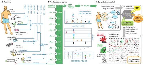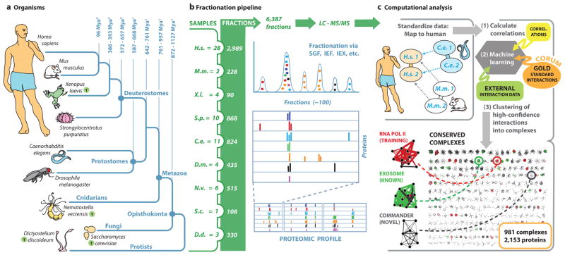 Figure 1. Workflowa, Phylogenetic relationships of organisms analyzed in this study. We fractionated soluble protein complexes from worm (C. elegans) larvae, fly (D. melanogaster) S2 cells, mouse (M. musculus) embryonic stem cells, sea urchin (S. purpuratus) eggs, and human (HEK293/HeLa) cell lines. Holdout species (‘T’, for test) likewise analyzed were frog (X. laevis), an amphibian; sea anemone (N. vectensis), a Cnidarian with primitive Eumetazoan tissue organization; slime mold (D. discoideum), an amoeba; and yeast (S. cerevisiae), a unicellular eukaryote. b, Protein fractions were digested and analysed by high performance liquid chromatography-tandem mass spectrometry (LC-MS/MS), measuring peptide spectral counts and precursor ion intensities. c. Integrative computational analysis: after ortholog mapping to human, correlation scores of co-eluting protein pairs detected in each ‘input’ species were subjected to machine learning together with additional external association evidence, using the CORUM complex database as a reference standard for training. High-confidence interactions were clustered to define co-complex membership. |
