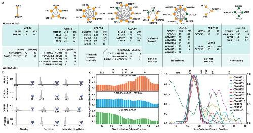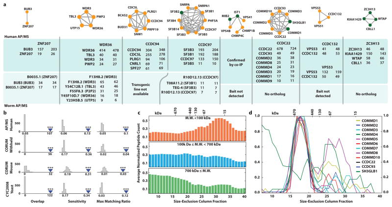 Figure 4. Physical validation of complexesa, Verification of complexes from tagged human cell lines and transgenic worms (see Extended Methods). Inset reports spectral counts obtained in replicate AP/MS analyses of indicated bait protein (header). MIB2-VPS4 complex confirmed by co-IP (Extended Data Fig. 6a). b, Conserved complexes significantly overlap large-scale AP/MS data reported for human cell lines (BioGrid pre-pub 166968, Huttlin et al., 2015) to a comparable extent as literature reference sets39,42, using 3 measures of complex-level agreement (see Extended Methods, Extended Data Fig. 6b); ***, p-value < 0.001, determined by shuffling (gray distributions). c, Agreement of inferred molecular weights (MW) of human protein complexes with size exclusion chromatography (SEC) profiles (data in c, d from ref. 43). d, Co-elution of human Commander complex subunits by SEC consistent with an approx. 500 kDa particle. |