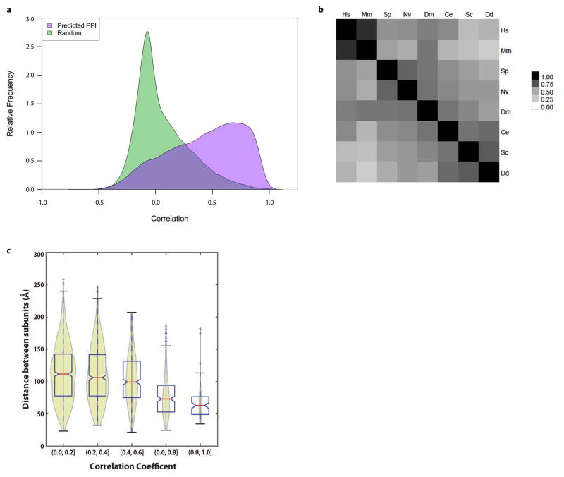Extended Data Figure 2. Properties of protein elution profilesa, Distribution of global protein tissue expression pattern similarity, measured as the Pearson correlation coefficient of protein abundance across 30 human tissues23, showing markedly higher correlations for 16,468 protein-protein pairs of putative co-complex interaction partners compared to the same number of randomized pairs of proteins in the network which were not predicted to interact. b, Heatmap illustrating the low to moderate cross-species Spearman’s rank correlation coefficients in the elution profiles observed between orthologous proteins during mixed-bed ion exchange chromatography (IEX-HPLC) under standardized conditions, highlighting the shift in absolute chromatographic retention times in different species. This variation indicates that the conservation of co-fractionation by putatively interacting proteins is not merely a trivial result stemming from fixed column retention times. c, The degree of co-fractionation is measured as the correlation coefficient between elution profiles. Spatial proximity is calculated from the mean of residue pair distances between components of multisubunit complexes with known 3D structures (see Extended Methods). |