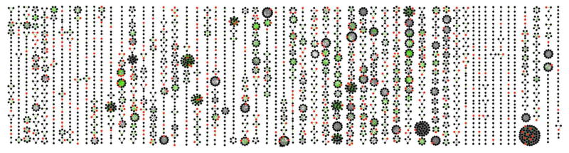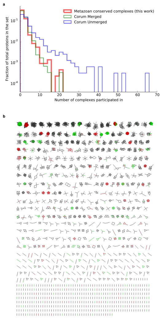Extended Data Figure 3. Derivation of complexesa, The 2,153 proteins present in the 981 derived metazoan complexes participate in multiple assemblies (‘moonlighting’) to an extent comparable to the sharing of subunits reported for literature-derived complexes (CORUM). For comparison, we examined the 1,550 unique proteins from the full CORUM set of 1,216 human complexes passing our selection criteria for supporting evidence (‘Unmerged’) and the 1,461 unique proteins from the non-redundant set of 501 merged complexes used as the reference for splitting our training and testing sets, with some of the largest complexes removed to avoid bias in training (‘Merged’; see ‘Optimizing the two-stage clustering’ in Extended Methods for details). b, Schematic of 981 identified complexes containing 2,153 unique proteins. In this graphical representation, 7,669 co-complex interactions are shown as lines, and proteins as nodes. Red and green interactions were previously annotated in CORUM. Red interactions were used in training the classifier and/or clustering procedure, while green interactions were held out for validation purposes. Gray interactions were not previously annotated in CORUM. |