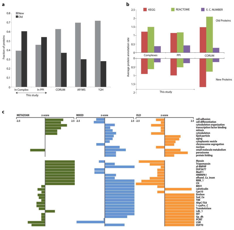 Extended Data Figure 4. Properties of new and old proteins and complexesa, The 2,153 protein components in the conserved animal complexes tend to be more ancient than the 2,301 proteins reported in the CORUM reference complexes or in two recent large-scale protein interaction assays, based on either the 7,062 proteins found by affinity purification/mass spectrometry (AP/MS; BioGrid 166968, Huttlin EL (2014/pre-pub), downloaded Feb 10th 2015) or the 3,667 proteins analyzed by yeast two-hybrid assays (Y2H)10. Ages are derived from OMA as in ref. 25. b, Annotation rates (mean count of annotation terms per protein) of old and new proteins in the derived complexes and pairwise PPI, compared with proteins in the CORUM reference complex set. Old proteins (defined by OMA) from the complexes generally exhibited higher annotation rates than new proteins. c, Differential enrichment of old, mixed and metazoan-specific protein complexes for functional annotations (select GO-slim biological process terms shown, top) and protein domains (Pfam, bottom). |