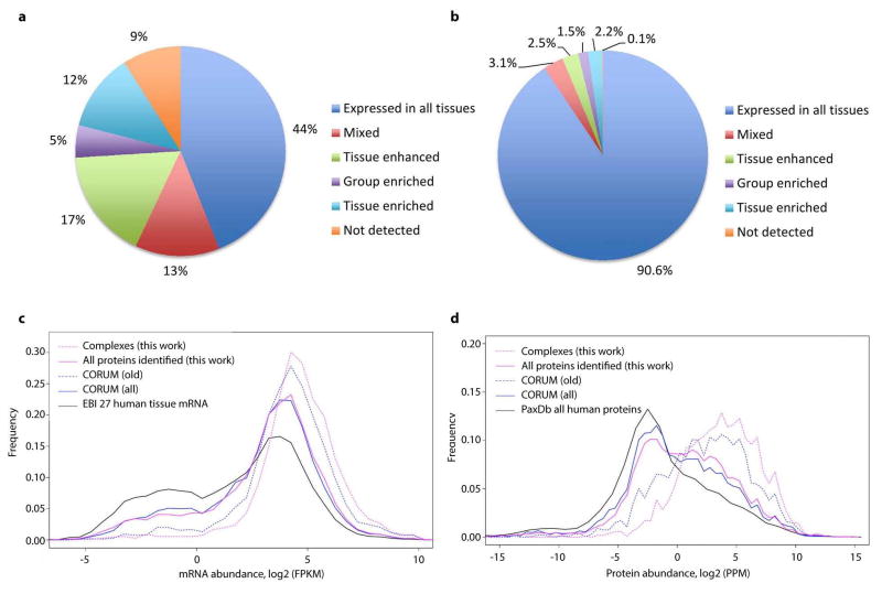 Extended Data Figure 5. Abundance and expression trends for proteins in complexesProteins within the identified complexes tend to be ubiquitously expressed across human tissues. Pie charts show the proportions of proteins with varying tissue expression patterns, from a recently published human tissue proteome map46, comparing: a, the full set of 20,258 human proteins, with b, the 2,131 proteins within the identified complexes. Consistent with these observations, 91% of the protein components in the complexes were expressed in >15 tissues in data from a reference human proteome23, compared to less than half (46%) of the 17,294 proteins in the overall reference set (Z-test p < 0.001). The distributions of average mRNA and protein abundances for all proteins identified and those within complexes are shown in panel c, mRNA abundances (data from EBI accession E-MTAB-1733) and d, protein abundances (data from PaxDb integrated dataset, 9606-H.sapiens_whole_organism-integrated_dataset). Evolutionarily ‘old’ proteins (defined by OMA as described in ref. 25 and mentioned earlier) tend towards higher abundances, even for proteins in reference complexes. |