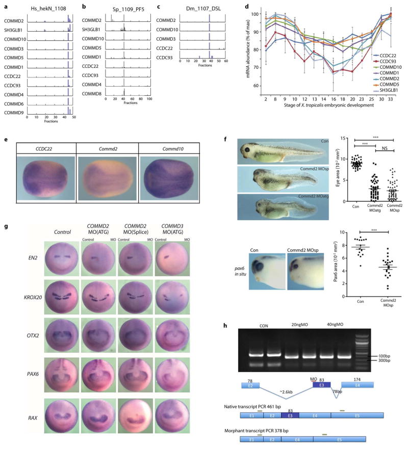 Extended Data Figure 9. Properties of the Commander complexThe automatically-derived 8 subunit Commander complex (Fig. 3b) was subsequently extended to 13 subunits (COMMD1 to 10, CCDC22, CCDC93, and SH3GLB1) based on combined analysis of AP-MS (Fig. 4a), size exclusion chromatograms43 (Fig. 4d), published pairwise interactions30,47,48, and analysis of elution profiles of the remaining COMM domain containing proteins, as shown here. Example protein elution profiles are plotted for Commander complex subunits observed from: a, HEK293 cell nuclear extract; b, sea urchin embryonic (5 days post-fertilization) extract; and c, fly SL2 cell nuclear extract; each fractionated by heparin affinity chromatography. d, Co-expression of Commander complex subunits during embryonic development of X. tropicalis (plotting mean +/− s.d. of 3 clutches; data from ref. 49). e, mRNA expression patterns of Commander complex subunits in stage 15 X. laevis embryos. Images show coordinated spatial expression in early vertebrate embryogenesis, as measured by in situ hybridization (3 embryos examined). f, Knockdown of Commd2 induced marked head and eye defects in developing X. laevis. (top) Commd2 antisense knockdown significantly decreased eye size, shown for stage 38 tadpoles (from 3 clutches; control n = 47 animals, 1 eye each); phenotypes were consistent between translation blocking (MOatg; n = 60) morpholino reagents, splice site blocking (MOsp; n = 50) morpholinos, and knockdowns of interaction partner Commd3 (see Fig. 5a). ***, p < 0.0001, 2-sided Mann-Whitney test. (bottom) Commd2 knockdown induced altered Pax6 patterning in the embryonic eye (control n = 8 animals, 2 eyes each; MO n = 11). g, Commd2/3 knockdown animals show altered neural patterning. Changes in stage 15 X. laevis embryos, measured by in situ hybridization (assayed in duplicates; 5 embryos per treatment), seen upon knockdown but not on controls: the forebrain marker PAX6 was expanded, while the mid-brain marker EN2 was strongly reduced. Strikingly, while expression of KROX20/EGR1 in rhombomere R3 was shifted posteriorly, expression in R5 was strongly reduced or entirely absent. Panels in Fig. 5b are reproduced from this figure and are directly comparable. h, Confirmation of splice-blocking Commd2 morpholino activity. Images and schematic show the basis and results of RT-PCR and agarose gel electrophoresis obtained with the corresponding X. laevis knockdown tadpoles. |