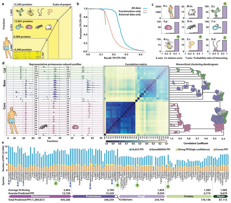 Figure 2. Derivation and projection of protein co-complex associations across taxaa, Expanded coverage via experimental scale-up relative to our previous human study6. Chart shows number of proteins detected, most (63%) in two or more species. b, Performance benchmarks, measuring precision and recall of our method and data in identifying known co-complex interactions (annotated human complexes from CORUM39). Complexes were split into training and withheld test sets; 5-fold cross-validation against 4,528 interactions derived from the withheld test set shows strong performance gains, beyond baselines achieved using only co-fractionation or external evidence alone. c, Plots showing high enrichment (probability ratio of interacting) of predicted interacting orthologous protein pairs (relative to non-interacting pairs) among highly correlated fractionation profiles, in both the holdout validation (test, ‘T’) and input species (colors reflect clade memberships). d, (left) Representative co-fractionation data (normalized spectral counts shown for portions of 3 of 42 experimental profiles) from human, fly, and sea urchin showing characteristic profiles of proteasome core, base and lid subcomplexes. Hierarchical clustering (right) of pan-species pairwise Pearson correlation scores (centre) is consistent with accepted structural models (PDB id: 4CR2; core, red; base, blue; lid, green; out-clusters, white). e, Projection of conserved co-complex interactions across 122 eukaryotic species, indicating overlap with leading public PPI reference databases39–41. STRING bars indicate excess over CORUM; GeneMania bars indicate excess over both; component and interaction occurences across Clades indicated at bottom. |