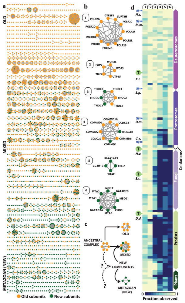 Figure 3. Prevalence of conservation of protein complexes across metazoa and beyonda, Conserved multiprotein complexes, identified by clustering, arranged according to average estimated component age (see Extended Methods and ref. 25). Proteins (nodes) classified as metazoan (green) or ancient (orange); assemblies showing divergent phylogenetic trajectories termed ‘mixed’. b, Example complexes with different proportions of old and new subunits. c, Presumed origins of metazoan (new), mixed, and old complexes; ‘?’ indicates variable origins of new genes. d, Heatmap showing prevalence of selected complexes across phyla. Color reflects fraction of components with detectable orthologs (absence, dark blue). Sea anemone (N. vectensis) most distant metazoan (Cnidarian) analyzed biochemically. |