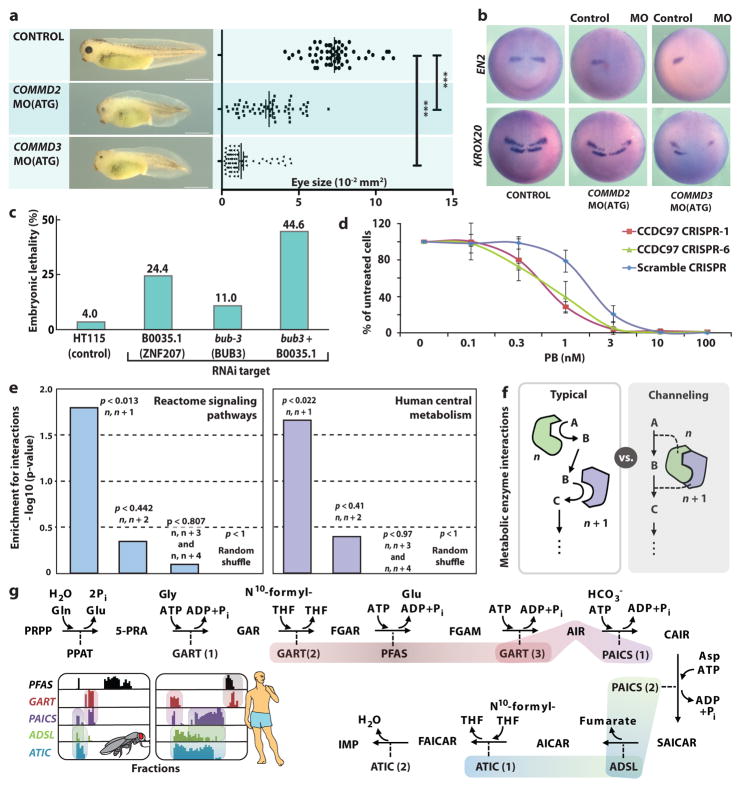 Figure 5. Functional validation of complexesa, Morpholino knockdown of COMMD2 (n = 55 animals, 2 clutches, 1 eye each) or COMMD3 (n = 64) in X. laevis embryos causes defective head and eye development (control n = 57; Extended Data Fig. 9f, h). ***, p < 0.0001, 2-sided Mann-Whitney test. b, COMMD2/3 knockdown animals (5 embryos per treatment examined) show altered neural patterning, including posterior shift or loss of expression of mid-brain marker EN2 and KROX20(EGR1), the latter in rhombomeres R3/R5 (compare to Extended Data Fig. 9g, h). c, Enhanced embryonic lethality (i.e., epistasis) following RNAi knockdown in C. elegans of B0035.1 (ZNF207) and bub-3 together (eggs laid: HT115, 1308; B0035.1, 1096; bub-3, 445; bub-3 + B0035.1, 341). d, Enhanced sensitivity (mean +/− s.d. across four cell culture experiments) of two independent CCDC97-knockout lines to the SF3b inhibitor pladienolide B (PB) relative to control HEK293 cells. e, Enrichment (permutation test p-value) for interactions among sequential pathway components and metabolic enzymes relative to shuffled controls (n refers to enzyme index, where n,n+1 denotes sequential enzymes, n,n+2 sequential-but-one, etc, as described in SI (“Analysis of consecutively acting signal transduction and metabolic enzyme interactions”). f, Metabolic channeling as opposed to traditional (typical) two-step cascade model. g, Conserved interactions among consecutively acting enzymes involved in purine biosynthesis (2 representative co-fractionation profiles of the 69 total generated are shown). |