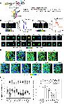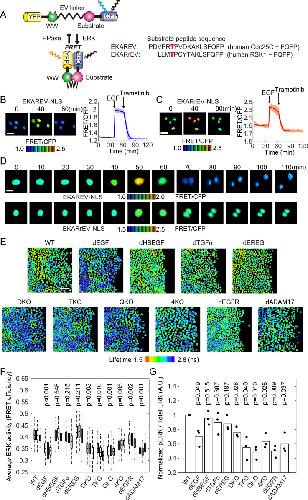 Figure 1. Properties of EKARrEV-NLS biosensor and ERK activity of MDCK cell lines after knockout of epidermal growth factor receptor ligand genes.(A) Mode of action of the intramolecular FRET biosensors for ERK, EKAREV, and EKARrEV. The red character T indicates the phosphorylation site. (B, C) MDCK cells expressing EKAREV-NLS (B) or EKARrEV-NLS (C) were observed under a wide-field fluorescence microscope to acquired FRET/CFP time-lapse images. During imaging, 10 ng mL-1−1 epidermal growth factor and 200 nM trametinib were added. Representative ratio images are shown in the IMD mode. Line plots show time courses of the FRET/CFP ratio for four cells from a single experiment. Solid lines represent the means; shaded areas represent SD. Scale bar, 40 μm. (D) MDCK cells expressing EKAREV-NLS (top) or EKARrEV-NLS (bottom) were imaged during mitosis, shown in the IMD mode. Scale bar, 20 μm. (E) Lifetime images of the donor fluorescence was acquired by a confocal microscope equipped with a 440 nm ps pulsed diode laser. MDCK cells are WT, single gene knockout (dEGF, dHBEGF, dTGFα, and dEREG), EGF/HBEGF double knockout (DKO), EGF/HBEGF/TGFα triple knockout (TKO), EGF/HBEGF/TGFα/EREG quadruple knockout (QKO and 4KO), EGFR knockout (dEGFR), and ADAM17 knockout (dADAM17). (F) Cells are time-lapse imaged every 10 min for 100 min. FRET efficiency of randomly chosen cells was plotted for each cell line. The total number of analyzed cells from two independent experiments is as follows: WT, 271, 231, and 201 cells; dEGF, 250, 255, and 171 cells; dHBEGF, 260, 136, and 206 cells; dTGFα, 227, 163, and 204 cells; dEREG, 236, 155, and 213 cells; DKO, 311, 241, and 293 cells; TKO, 253, 229, and 189 cells; QKO, 263, 232, and 186 cells; 4KO, 252, 255, and 179 cells; dEGFR, 217, 155, and 153 cells; dADAM17, 146, 140, and 198 cells. (G) 9 h after the removal of silicone confinement, MDCK cells were analyzed by immunoblotting with anti–phospho-ERK or anti–pan-ERK antibody. The phospho-ERK signal normalized to the pan-ERK signal is shown. Data from three independent experiments are shown. (F, G)