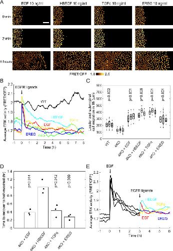 Figure S3. Restoration of migration by addition of epidermal growth factor receptor (EGFR) ligands in 4KO cells.(A) 4KO cells were subjected to confinement release assay as described in the legend to Fig 1. Images of CFP and FRET channels were acquired every 2 min for 12 h (Videos 4). Shown are snapshots before, just and 8 h after the addition of 10 ng ml−1 recombinant EGFR ligands. Scale bar, 100 μm. (B) Time course of the average FRET/CFP ratio. At time 0, 10 ng ml−1 recombinant human EGF (red), HBEGF (light blue), TGFα (yellow), and EREG (blue) were added to 4KO cell lines. WT (black) and 4KO (green) are controls without any EGFR ligands. (C) Leader cell migration in 8 h after the addition of EGFR ligands or after the release of silicone confinement (WT and 4KO). The numbers of analyzed cells are as follows: WT, 357, 215, and 283 cells; 4KO, 348, 274, and 328 cells; 4KO + EGF, 154, 128, and 193 cells; 4KO + HBEGF, 160, 253, and 235 cells; 4KO + TGFα, 301, 274, and 213 cells; 4KO + EREG, 236, 219, and 86 cells. Data of three independent experiments are shown. P-values of two-tailed t test (4KO to others) are shown in the panel. (D) Time to the half-maximal activity after the addition of EGFR ligands. Data of three independent experiments are shown. P-values of two-tailed t test (4KO + HBEGF to others) are shown in the panel. (E) Time course of the average FRET/CFP ratio. At time 0, 10 ng ml−1 recombinant human epidermal growth factor were added to 4KO cell lines, then at time 3 h, 10 ng ml−1 recombinant human epidermal growth factor (red), HBEGF (light blue), TGFα (yellow), and EREG (blue) were added to 4KO cell lines. |