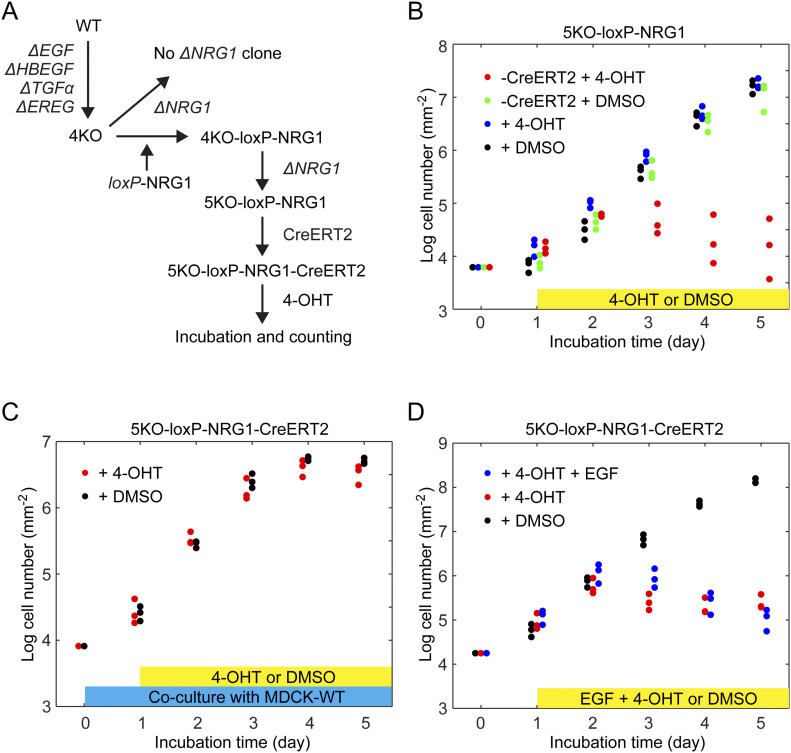Figure 5. Growth arrest of cells deficient from all epidermal growth factor receptor ligands.(A) Schematics of experiment to obtain 5KO cell line. The MDCK-4KO cells expressing EKARrEV biosensor were transfected stably with an expression vector for loxP-NRG1- loxP named as 4KO-loxP-NRG1. Then 5KO-loxP-NRG1 was generated by knocking out endogenous NRG1. Followed by integrating CreERT2, 5KO-loxP-NRG1-CreERT2 was treated with 4-OHT to obtain 5KO cell line. (B) The growth rate represented on a log (cell number) basis. Cell numbers was measured over 5 d post-seeding of 5KO-loxP-NRG1 cell line with addition of 4-OHT (blue dots) or DMSO (black dots) and 5KO-loxP-NRG1-CreERT2 cell line with addition of 4-OHT (red dots) or DMSO (green dots) at day one. Each dot represents cell number in an independent experiment. (B, C) 5KO-loxP-NRG1-CreERT2 cells were co-cultured with equal number of MDCK-WT cells and analyzed as in (B). (B, D) 5KO-loxP-NRG1-CreERT2 cells was analyzed as in (B) except that epidermal growth factor was exogenously added with 4-OHT. |