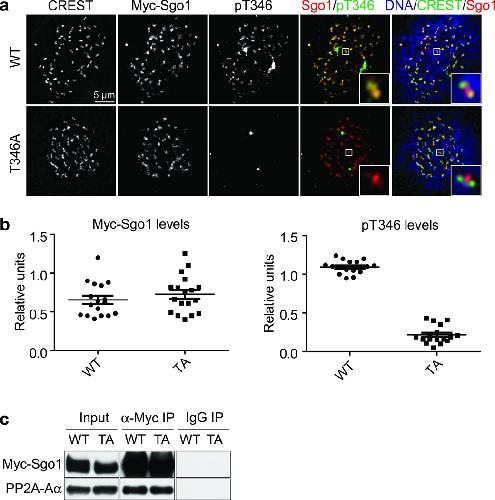 Figure 3. Sgo1 T346A localizes to centromeres and binds to PP2A(a) Mitotic HeLa Tet-On cells stably expressing Myc-Sgo1 WT or T346A were stained with the indicated antibodies. The boxed areas in the overlay were magnified and shown in inset. (b) Quantification of the intensities of α-Myc and α-pT346 Sgo1 staining of cells in a. Each dot in the graph represents a single cell (WT, n=18; T346, n=19). (c) Lysates of mitotic cells in a were immunoprecipitated with IgG or α-Myc. The total cell lysate (Input), IgG IP, and α-Myc IP were blotted with the indicated antibodies.