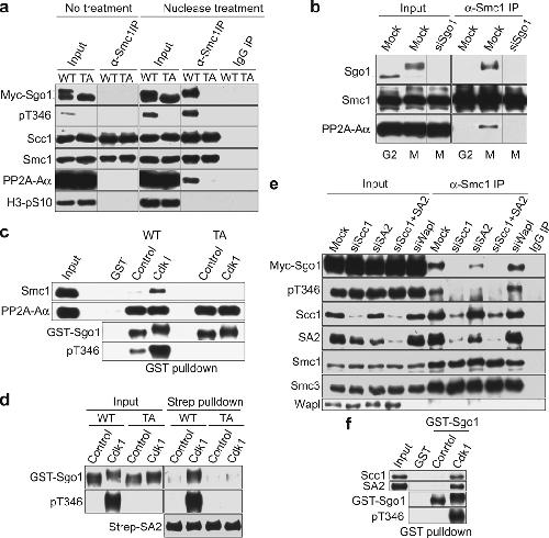 Figure 4. Sgo1 T346 phosphorylation promotes its binding to cohesin(a) Mitotic HeLa Tet-On cells stably expressing Myc-Sgo1 WT or T346A (TA) were lysed with or without Turbo Nuclease. The total cell lysates (Input) and IgG/α-Smc1 immunoprecipitates (IP) were blotted with the indicated antibodies. (b) HeLa Tet-On cells were either mock transfected or transfected with siSgo1, collected at 7 hr after a thymidine block (G2) or in mitosis (M), and lysed with the nuclease-containing buffer. The total cell lysates and α-Smc1 IP were blotted with the indicated antibodies. (c) Glutathione-Sepharose beads bound to GST, GST-Sgo1 WT, or T346A (TA) proteins treated with buffer or cyclin B–Cdk1 were incubated with mitotic HeLa Tet-On cell extracts. The proteins bound to beads were blotted with the indicated antibodies. (d) Lysates of mitotic HeLa Tet-On cells stably expressing StrepII-SA2 were incubated with Strep-Tactin beads. After washing, the beads were incubated with GST-Sgo1 WT or T346A (TA) that had been treated with buffer or cyclin B–Cdk1. The input Sgo1 proteins and proteins bound to beads were blotted with the indicated antibodies. (e) HeLa Tet-On cells stably expressing Myc-Sgo1 were mocked transfected or transfected with the indicated siRNAs, collected at mitosis, and lysed in the presence of nuclease. The total cell lysates (Input) and α-Smc1 IP were blotted with the indicated antibodies. IgG IP from mock transfected cells was used as a negative control. Note that the commercial Wapl antibody (Bethyl) failed to detect Wapl in α-Smc1 IPs. (f) GST or GST-Sgo1 pre-treated with buffer or cyclin B–Cdk1 were immobilized on glutathione-Sepharose beads. The beads were then incubated with lysates of Sf9 cells expressing recombinant human Scc1-His6 and SA2. The Sf9 lysate (Input) and proteins bound to beads were blotted with the indicated antibodies.