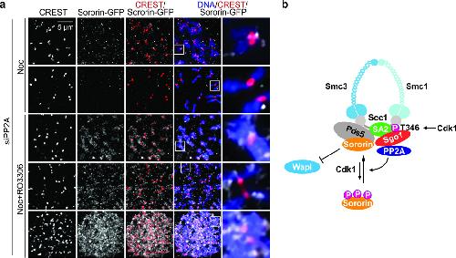 Figure 8. Sororin dissociation from mitotic chromosomes requires Cdk1(a) HeLa Tet-On cells stably expressing sororin-GFP transfected with siPP2A Aα were synchronized by a thymidine-arrest-release protocol. At 8 hrs after thymidine release, nocodazole was added to arrest cells in mitotic for 3 hrs. Mitotic cells were collected and were either untreated or treated with the Cdk1 inhibitor RO3306 (10 µM) for 15 min. The cells were stained with DAPI and the indicated antibodies. The boxed regions in the overlay were enlarged and shown on the right. (b) Model for how Sgo1–PP2A maintains centromeric cohesion during mitosis in human cells.