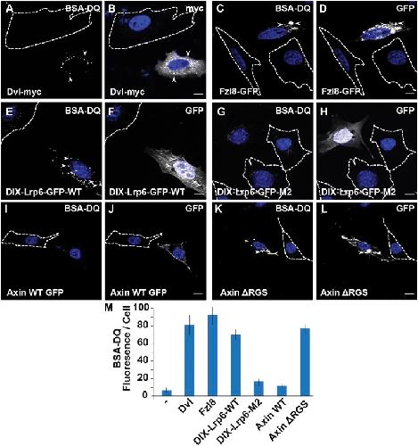 Fig. 2. Endocytosis and lysosomal degradation of BSA-DQ is increased by transfection of DNA constructs that activate the Wnt pathway. Untransfected cells serve as controls and are demarcated by a stippled line. (A and B) Fluorescence microscopy images showing that Dvl-myc overexpression increases endocytosis of BSA-DQ and degradation in HeLa cells (arrowheads); note that the untransfected cell has less BSA-DQ fluorescence than the transfected cell. (C and D) Overexpressed Wnt receptor Fz8 triggers BSA-DQ endocytosis (arrowheads). (E and F) Transfection of the fusion protein DIX-Lrp6-GFP, a strong activator of the Wnt pathway, triggered increased BSA-DQ endocytosis (arrowheads). (G and H) The control DIX-LRP6-GFP-M2 mutant, which has two mutations in the DIX domain of Dvl and is inactive in Wnt signaling (42), did not increase endocytosis. (I and J) Axin, an inhibitor of the Wnt pathway, did not affect endocytosis. (K and L) Dominant-negative Axin ΔRGS increased endocytosis of BSA-DQ (arrowheads). (M) Quantification of the activation of Wnt signaling by overexpression of a multiple-transfected DNA construct. Fluorescence per cell was quantified, as described in Materials and Methods analyzing a minimum of 25 transfected cells per condition. Untransfected NIH 3T3 cells are indicated by the minus (−) label. The M2 mutant DIX-Lrp6Ctail-M2 and Axin wild-type serve as negative controls that did not increase Wnt signaling nor endocytosis. (Scale bars, 10 μm.)