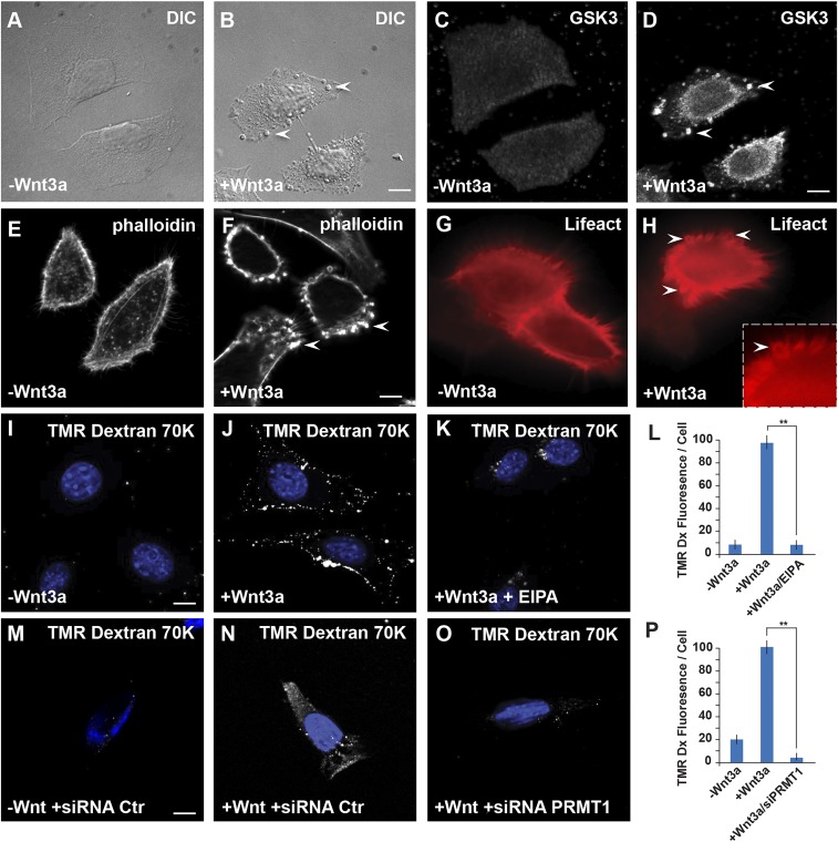 Fig. 1. Wnt signaling induces the formation of large vesicles generated by macropinocytosis. (A and B) Phase contrast images of HeLa cells showing that 20 min of Wnt treatment induces the formation of large vesicle-like structures (arrowheads). (C and D) In situ proteinase K protection assay (8) showing that GSK3, a key enzyme in the Wnt pathway, is translocated from the cytoplasm into large MVBs following Wnt3a treatment for 20 min. (E and F) Wnt3a induces rearrangement of the cortical F-actin cytoskeleton visualized by phalloidin staining; note that actin surrounds large vesicles 20 min after stimulation of HeLa cells with Wnt3a. (G and H) Still images from Movie S1 showing that F-actin (visualized with transfected LifeAct) at the leading edge lamellipodium forms macropinocytotic vesicles within 20 min of treating SW480APC cells with Wnt. (I–L) Wnt induces macropinocytosis in NIH 3T3 cells, assayed by uptake of TMR-dextran 70 kDa and inhibition with the amiloride derivative EIPA. (M–P) Depletion of the enzyme PRMT1 (which is essential for the activation of the Wnt pathway), but not control scrambled siRNA (8), blocked macropinocytosis in NIH 3T3 cells. **P < 0.01. (Scale bars, 10 μm.)