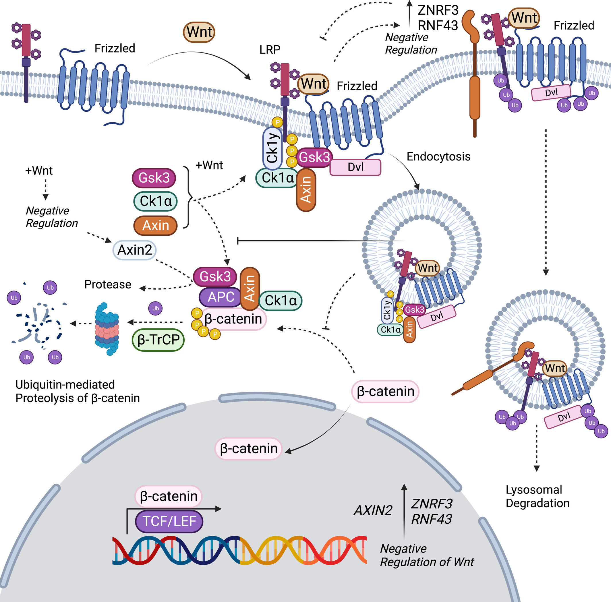 Model of Wnt/β-catenin pathway in the presence and absence of Wnt ligand. This model illustrates the Wnt/β-catenin pathway's activity in response to the presence or absence of the Wnt ligand. Without Wnt, the proteins APC, Axin, CK1, DVL, and GSK3 constitute the destruction complex that controls β-catenin levels, influencing Wnt signaling. Upon Wnt ligand binds with the Frizzled (Fz) receptor and the LRP-6 co-receptor, GSK3 translocates to the membrane and is then internalized into an early endosome and subsequently into multivesicular bodies (MVBs). This process, which sequesters GSK3 and the destruction complex, triggers macropinocytosis in the Wnt pathway. In the cell nucleus, β-catenin forms an active complex with LEF (lymphoid enhancer factor) and TCF (T-cell factor) proteins by displacing TLE/Groucho complexes and recruitment of histone-modifying co-activators such as CBP/p300, BRG1, BCL9, and Pygo. Such a transcriptional switch leads to a change in multiple cellular processes, such as the activation of genes involved in proliferation and cell migration. Additionally, the transmembrane E3 ligases RNF43/ZNRF3 represent important elements down regulators of the Wnt signaling through the ubiquitination and degradation of the Fzd/Lrp5/6 receptor complex via the endolysosomal pathway. While β-catenin is recognized as an important oncogene, it is also pivotal for cell adhesion as a structural component of the cadherin complex structure (detailed in Figure 3) (Figure created with BioRender.com, accessed on 11 July 2023.). APC, adenomatous polyposis coli; GSK3, glycogen synthase kinase 3; LRP-6, LDL-receptor-related protein 6. |