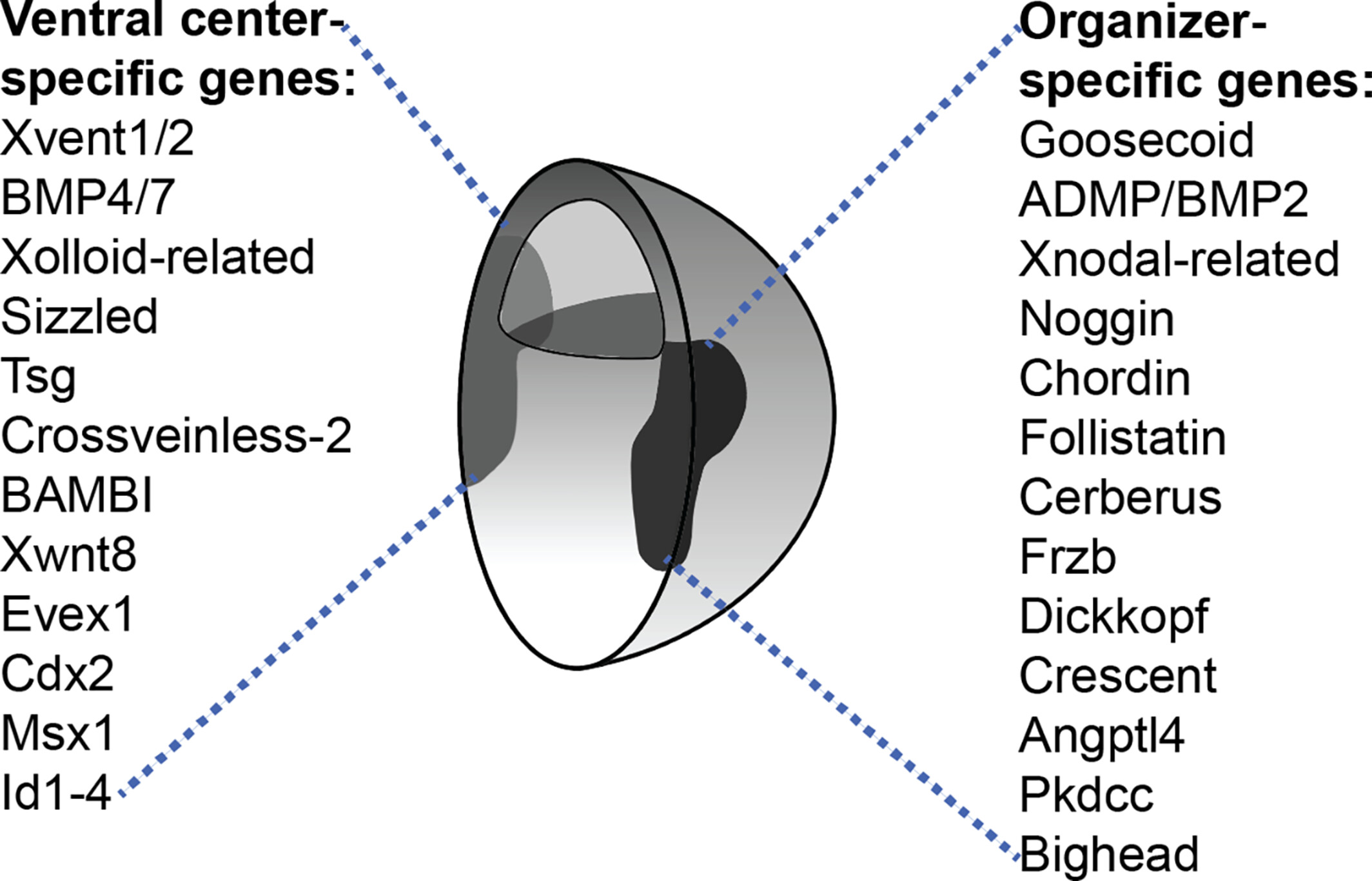 Genetic expression in dorsal and ventral regions of the early Xenopus laevis gastrula. Genes specifically expressed in the dorsal and ventral fragments of the early Xenopus laevis gastrula have produced a plethora of new genes involved in embryonic patterning. Many components of the dorsal and ventral region of the Spemann organizer in the Xenopus gastrula have been a rich source of new molecules and developmental mechanisms. Many of the novel genes identified encoded secreted antagonists of the BMP and the Wnt pathways. Diagram based and modified from De Robertis and Tejeda-Muñoz.47 |