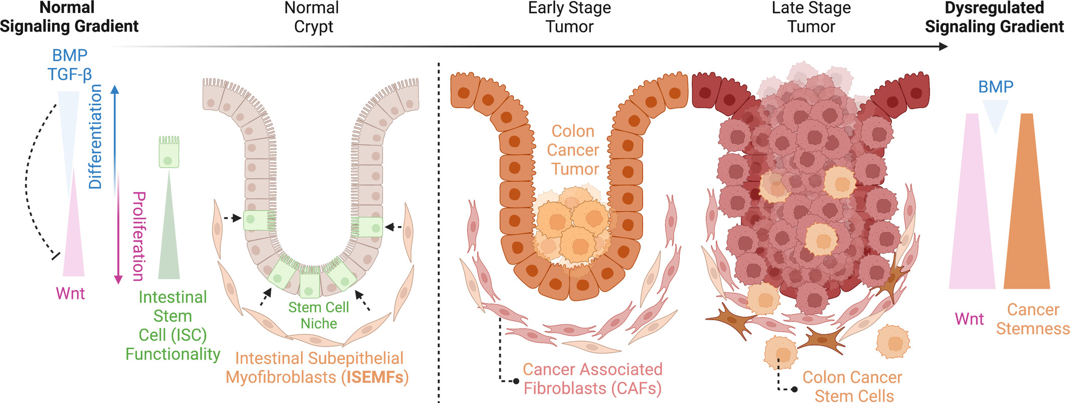 Progression of colon cancer from normal crypt to dysregulated signaling. This figure illustrates the progression from a normal intestinal crypt to colorectal cancer (CRC), highlighting the crucial role of APC (adenomatous polyposis coli) mutations in approximately 85% of colon cancer cases. In a normal crypt, a balance of signaling gradients, including BMP, TGF-β, and Wnt, maintain intestinal stem cell functionality and healthy tissue architecture. APC mutations disrupt this equilibrium. Initially, the loss of APC function leads to benign polyps characterized by epithelial dysplasia. As CRC progresses to invasive colon cancer, it typically involves a series of mutations, such as a single activating K-Ras mutation, a homozygous loss of the tumor suppressor Smad4/DPC4 (Deleted in Pancreatic Carcinoma 4), and mutations in both copies p53 genes, amounting to seven mutations on average before malignancy.79-82 These mutations, alongside disruptions in normal signaling gradients, transform normal cells into cancer-associated fibroblasts (CAFs) and colon cancer stem cells, leading to a dysregulated signaling environment conducive to tumor growth. The figure also delineates the rise in Wnt signaling and subsequent decrease in BMP signaling, contributing to increased cancer stemness in the tumor microenvironment. Some CRC cases developed without prior polyposis and are caused by mutations in DNA mismatch repair genes.79, 81-83 Even in these CRC cases, the Wnt pathway is frequently activated, whether through mutations in Axin1, Axin2, RNF43, or ZNRF3, overexpression of R-Spondin 2 or 3, or mutations that stabilize β-catenin (Figure created with BioRender.com, accessed on 11 July 2023). |