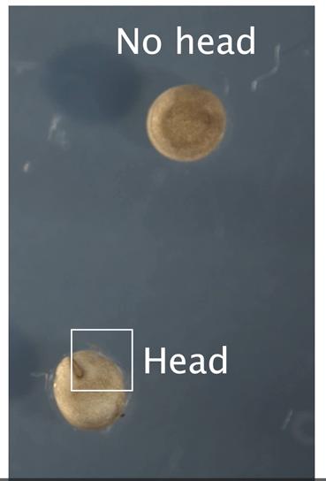 Movie S1. Inhibition of Wnt signaling: “no head.” With its fast-embryonic development, large egg size (1–2 mm in diameter), and high numbers of embryos (1500 per female), Xenopus is a great in vivo model for studying vertebrate development and Wnt signaling, and it has been used widely to probe the events in early embryogenesis. The Xenopus model is known to have about 79% of similar genes in common with human disease genes.84 The frog embryo is also a unique system where the dorsal and the ventral sides are easy to distinguish. The difference in maternal pigmentation along the dorsoventral body axis is visible at the 1-cell and early cleavage stage. The ventral side, the darker part, and the light part, the dorsal side where Wnt signaling takes place. The difference in pigmentation is a consequence of a process called cortical rotation. The Wnt pathway is one of the first signals that appear during development.85 Wnt signaling depends completely on β-catenin. In this movie, we can see a control embryo and how dorsal development is taking place. When β-catenin is depleted (with β-catenin morpholino injected with 24 ng four times into the marginal-vegetal region at the two-cell stage), Xenopus embryos lack Spemann organizer dorsal mesoderm and all neural development, resulting in radially ventralized embryos. By tailbud stages, the cement gland, which is a pigmented head structure (inside the white square), an extremely useful anterior marker, is almost fully differentiated. |