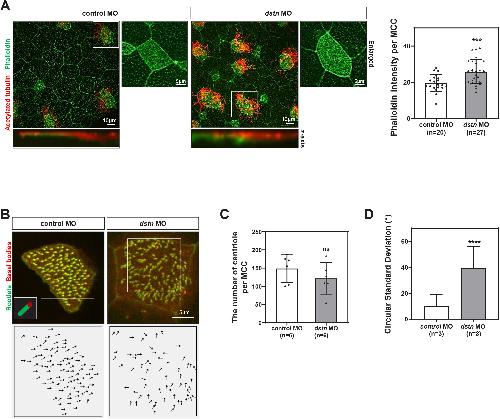 Fig. 2. Dstn is required for ciliogenesis during Xenopus embryonic development. (A) Xenopus epidermal MCCs marked by immunofluorescence using anti-acetylated tubulin (red) for cilia and phalloidin (green) for actin filament network (scale bar=10 μm; enlarged scale bar=5 μm). Statistical quantitation of phalloidin intensity revealed a significant increase in phalloidin intensity per MCC in dstn-depleted embryos as compared to control embryos. (B) Centrin-RFP and Clamp-GFP exhibited perturbation of basal body polarity in dstn-depleted embryos compared with coordinated polarity and alignment in control embryos. It is highlighted by black arrows (scale bar=5 μm). (C) We have quantified the number of centrioles per MCC in Xenopus epidermis and data showed that dstn knockdown did not significantly affect the number of centrioles in dstn morphant embryos. (D) The polarization was analyzed by angular measurements of Centrin/Clamp pairs in MCCs. Statistical analysis of data showed that dstn inhibition increased the circular standard deviation compared with control embryos (n=3). * p<0.05, ** p<0.01, *** p<0.001, **** p<0.0001, MO, morpholino oligonucleotides; MCC, multiciliated cells.