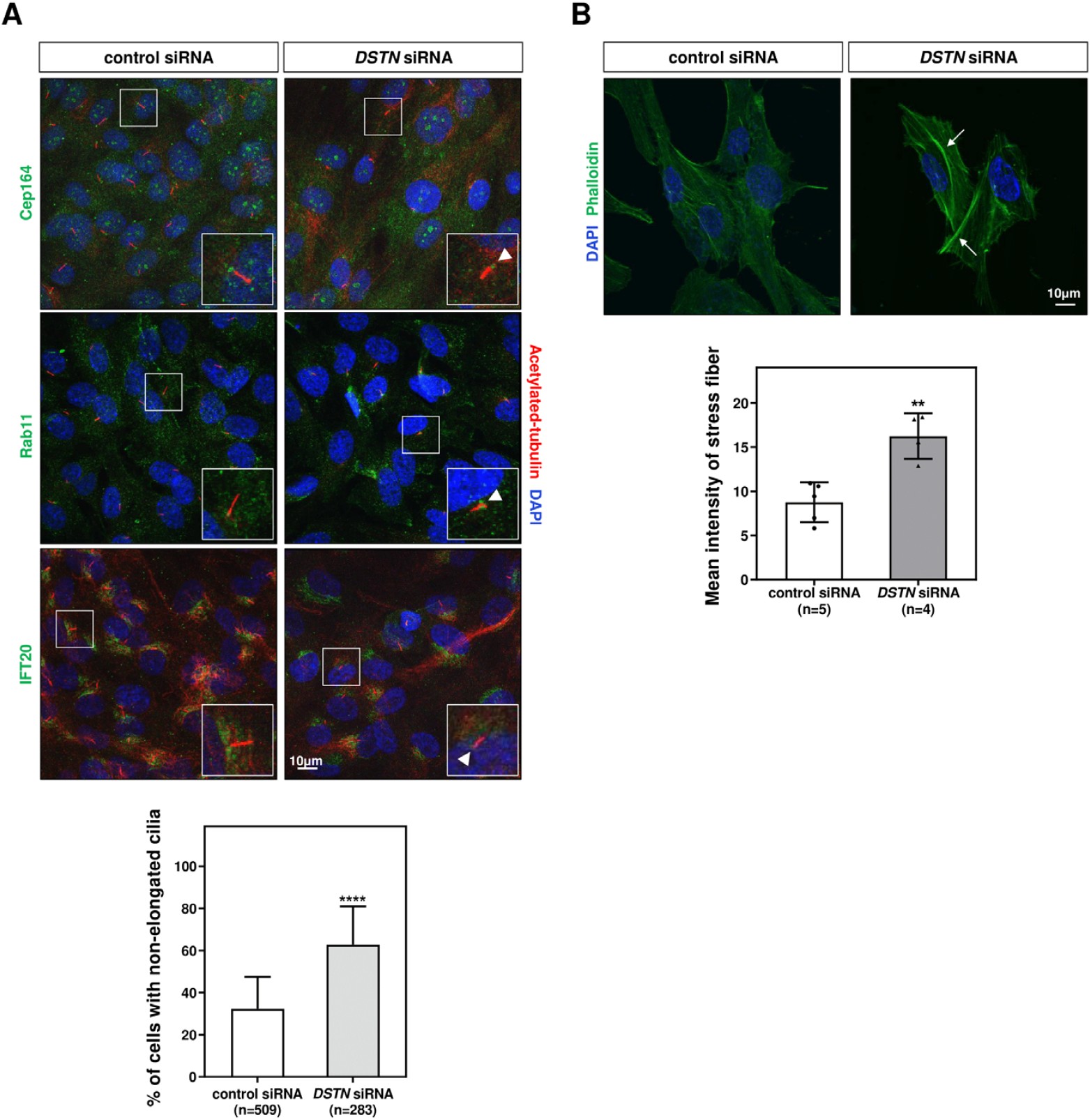 Fig. 4. Depletion of DSTN affects axonemal elongation but does not perturb the docking of ciliary vesicles to centrioles. (A) hRPE1 cells were transfected with DSTN siRNAs and serum-starved for 48 hrs to induce ciliogenesis. The transfected cells were immunostained with antibodies against Cep164, Rab11, and IFT20 (green) along with acetylated tubulin (red). Loss of DSTN did not perturb the docking of ciliary vesicles to centrioles in hRPE1 cells. However, the axonemal length was considerably reduced in DSTN-depleted hRPE1 cells, as indicated by white arrowheads compared with control cells. A graph indicated the significant reduction in axonemes in hRPE1 cells devoid of DSTN, but no effect was observed for vesicle docking to centrioles after the loss of DSTN (scale bar=10 μm). (B) Immunofluorescence revealing stress fibers using phalloidin indicated that loss of DSTN in hRPE1 cells resulted in thicker stress fibers compared to thin fibers in control cells. White arrows indicated the thickness of stress fibers in control versus knockdown cells. Statistical analysis demonstrated that DSTN depletion resulted in increased mean phalloidin intensity (scale bar=10 μm). The level of significance is shown as * p<0.05, ** p<0.01, *** p<0.001, **** p<0.0001.