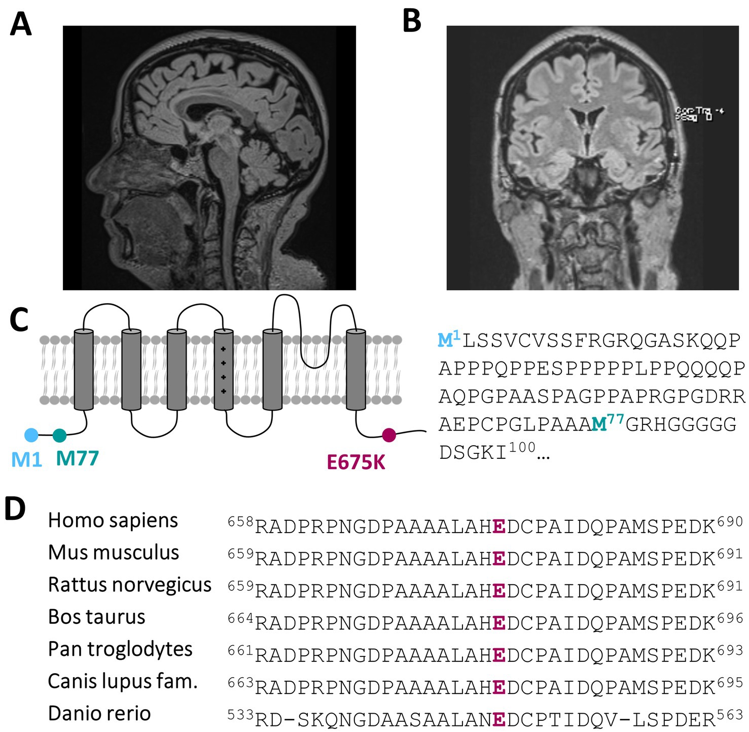 Figure 1. A heterozygous KCNC3 variant in an atypical case of SCA13 with a dominant central rotational vertigo, only mild progressive cerebellar symptoms and an early onset of cognitive impairment. (A) Mid-sagittal T1/T2 and Flair-sequence MR image of the patient in 2024 showing a mild cerebellar atrophy and (B) a global reduction of brain volume. (C) Topology of a Kv3.3 channel subunit. The location of the E675K variant is highlighted in purple and the location of the alternative start of the N-terminus is highlighted in turquoise. (D) Partial amino acid sequence alignment of different Kv3.3 orthologues. The conserved E675 residue is highlighted in purple. |