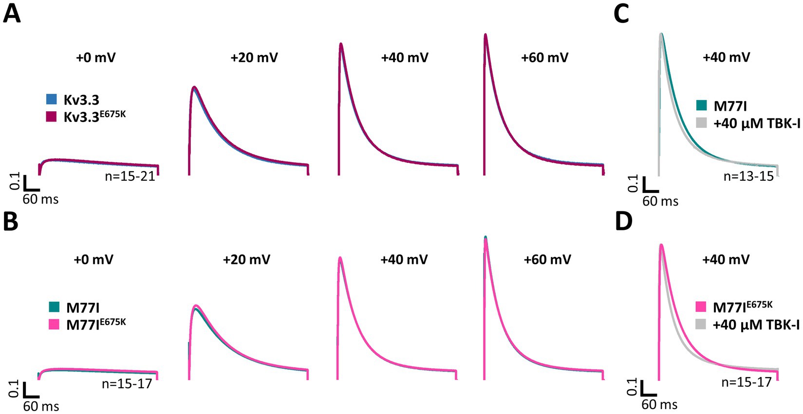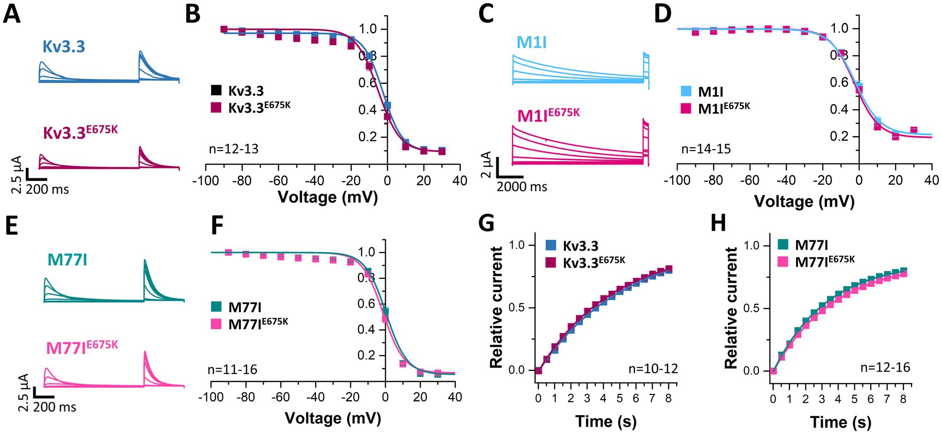 Kv3.3M1I/E675K variant. (A) Averaged current traces to illustrate the voltage-dependence of activation