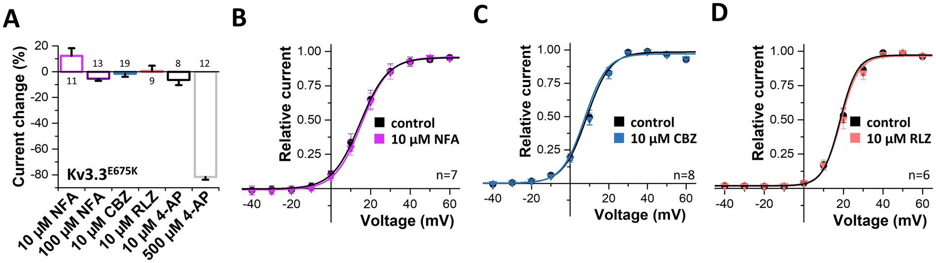 Figure 6. Search for drugs to rescue the Kv3.3E675K-mediated loss-of-function. (A) Analysis of the current changes of the Kv3.3E675K variant by the application of niflumic acid (NFA), carbamazepine (CBZ), riluzole (RLZ) or 4-AP, analyzed at +40 mV. (B) Conductance-voltage relationships before and after perfusion with 10 μM niflumic acid, (C) 10 μM carbamazepine or (D) 10 μM riluzole. The voltage protocol is illustrated in Supplementary Figure 5A. Data are presented as mean ± s.e.m. The number of replicates is indicated within the graphs. |