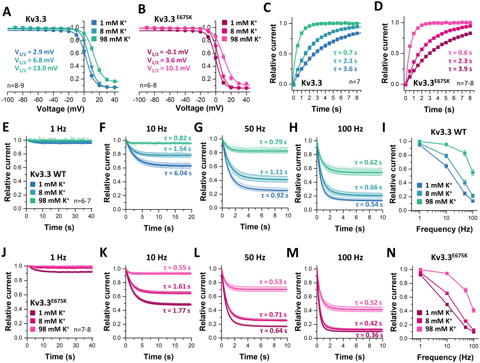 Figure 8. Rescue of Kv3.3 and Kv3.3E675K, by a shift in the voltage-dependence of inactivation, speeding of the recovery from inactivation and a reduced cumulative inactivation, mediated by [K+]ex. Inactivation curves of (A) Kv3.3 or (B) Kv3.3E675K at different [K+]ex. The V1/2 of inactivation for the different [K+]ex are provided within in the graphs. The voltage protocol is illustrated in Supplementary Figure 5C. (C) Recovery from inactivation of Kv3.3 or (D) Kv3.3E675K at different [K+]ex. The time constants τ for the recovery from inactivation are calculated from the mono-exponential fits illustrated within the graphs. The voltage protocol is illustrated in Supplementary Figure 5F. Cumulative inactivation of Kv3.3 (E–I) and Kv3.3E675K (J–N) at (E,J) 1 Hz, (F,K) 10 Hz, (G,L) 50 Hz, and (H,M) 100 Hz recorded at different [K+]ex. The indicated time constants τ for the first 2 s of cumulative inactivation are calculated from mono-exponential fits. The voltage protocol is illustrated at Supplementary Figure 5G. (I,N) Relative currents of Kv3.3 (I) and Kv3.3E675K (N) after 10 s of pulsing with different frequencies at different [K+]ex, normalized to the current amplitude of the first pulse. Data are presented as mean ± s.e.m. The number of replicates is indicated within the graphs. |
