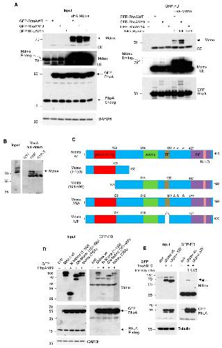 Figure 6. Mdmx interacts with the inactive GDP form of RhoA through its Zn finger domain. (A) A375 cells were transfected with GFP-tagged RhoA constructs (3 μg) and HA-Mdmx (3 μg) as indicated. After 24 h post-transfection, extracts were used for GFP trap pull-downs (PD) before eluates, and total cell extracts were used for Western blot analysis. SE: Short exposure, LE: Long exposure. (B) Recombinant GST-RhoA loaded in vitro either with GDP or GTPγS was used for pull-down assays with A375 cell extracts. Eluates and total cell extracts were used for Western blot analysis. (C) Schematic representation of the Mdmx protein domains. ZF: Zinc Finger, RF: Ring Finger, NoLS: nucleolus localisation signal-adapted from [56]. The * indicate the phosphorylation sites S342/S367/S403 mutated into Alanine (3SA Mdmx mutant). (D) Experiment was performed as in (A) using, instead, the indicated Mdmx constructs and the GFP-RhoAN19 mutant. GFP trap pull-down (PD) eluates and total cell extracts were used for Western blotting. (E) Experiment as in (D) using the wild type and Zn finger (ZF) deletion Mdmx mutant. Arrows indicate the wild type and Zn finger deletion mutant.